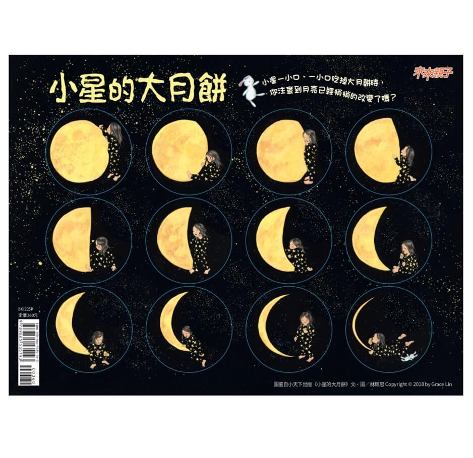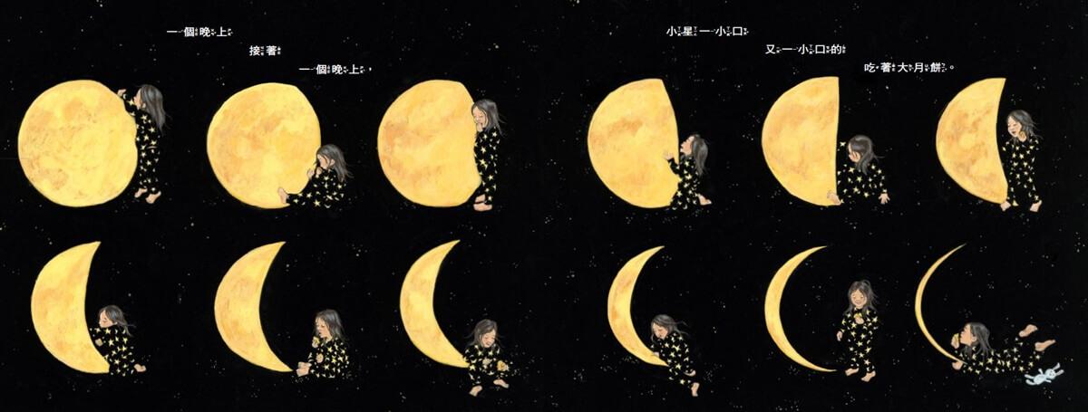 在這個充滿想像力的原創故事裡,凱迪克銀牌獎、紐伯瑞文學獎銀獎得主林珮思,巧妙結合了中秋節、月餅與月相變化,再揉進母女間濃濃的愛,創作出一則暖心又甜蜜的現代童話。整本書既奇幻又寫實,在全黑的書頁上,小星和媽媽彷彿生活在宇宙星空中,瀰漫著一股超現實的神祕感,然而她們母女間的親子互動卻又非常真實,小星調皮的神情和可愛的笑容,就像鄰家小女孩一樣親切。