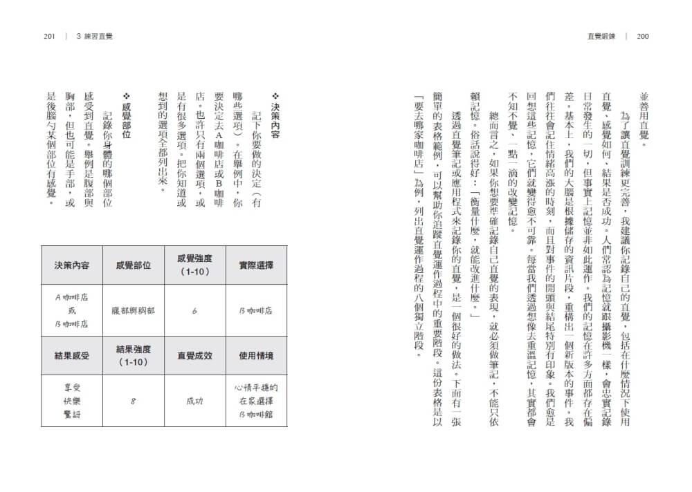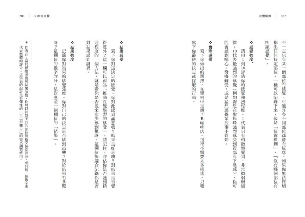 至於直覺到底能不能鍛鍊呢?答案是:可以!皮爾森設計了一份直覺運作八階段表格放在書中,讓你可以日常練習。從今以後,在你的專業之外,又多了直覺這個得力助手,怎能不讓人興奮呢?
