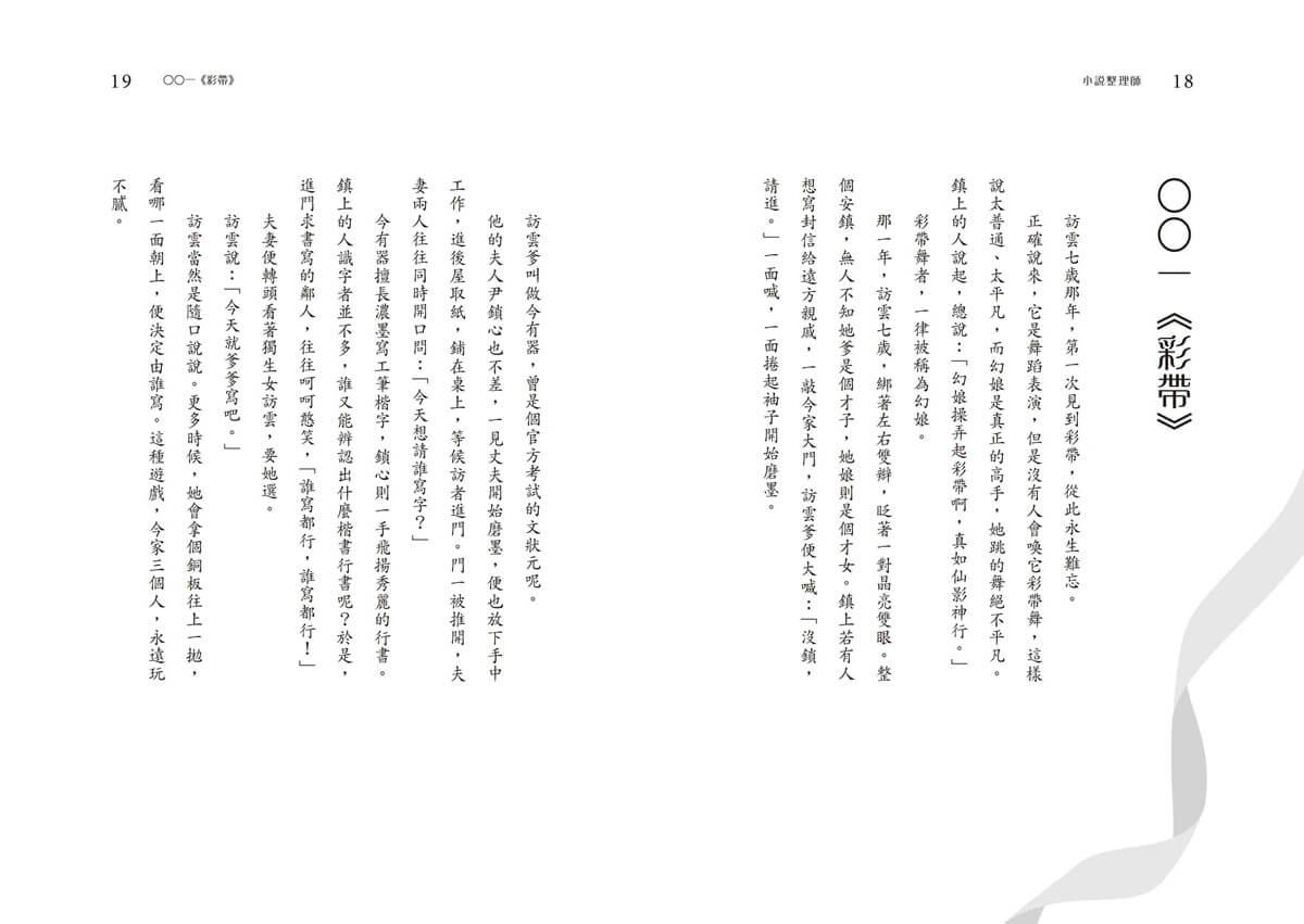 大學畢業,一心成為小說家的李雲寶陷入寫作瓶頸,偶然間,她發現了一個神祕的AI程式——「小說整理師」,透過程式中海威、珍汀、吳明三位整理師的對話,李雲寶漸漸找到創作下一本書《彩帶》的方向,對「小說整理師」 的依賴也日益加深。