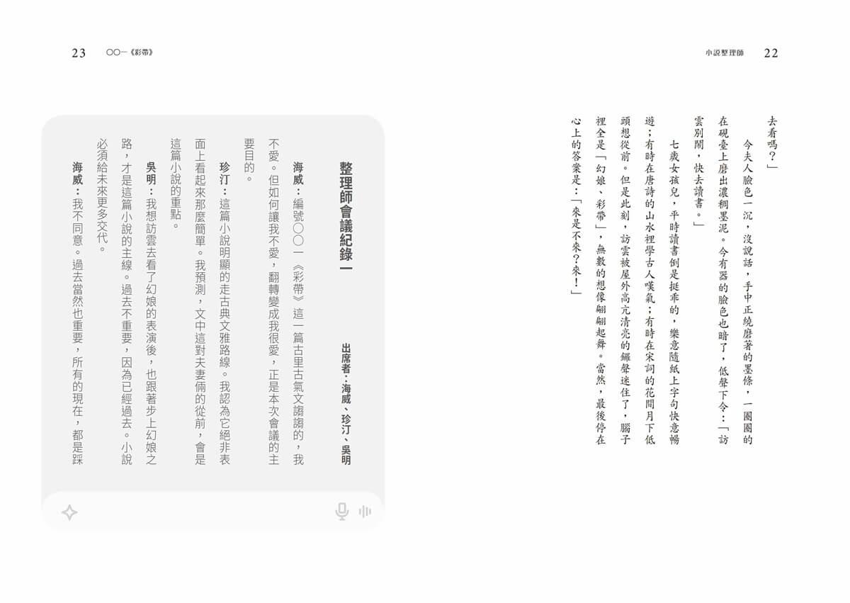 特色2書中有書X文學賞析:故事圍繞在主角書寫的小說與AI的修改建議發展,讀者不僅是單向閱讀一本書,同時也與AI一同拆解文本,思考好看的小說應具備何種條件?