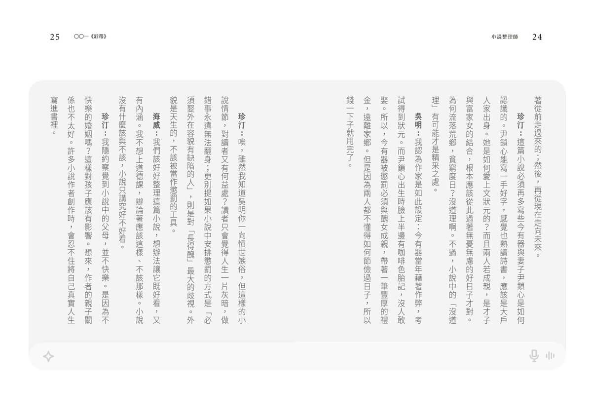▲:若要我說,作者不僅洞見我們這個充斥AI的時代現象,包括寫作與圖/文創作軟體,還能夠精心設計出像「小說整理師」這般,「既像評審委員又似資深讀者」的AI軟體,大膽透明化整個評議過程,每位委員共識之點(如古典vs. 當代小說寫作語言風格差異的重視、不能僅拋出懸疑或懸念而不處理後續可能發展的作者責任),以及各自委員的讀者反應(如劇情可如何推進、角色們背景故事可如何強化、哪個看似邊緣角色深具潛力而加以發展、孩童主角的年齡設定與兒童讀者能否了解成人世界等等……)。再者,提供給創作者的後續建議很是精采,替讀者言說了該作各種發展的潛力及可能,連我都想創作了呢!