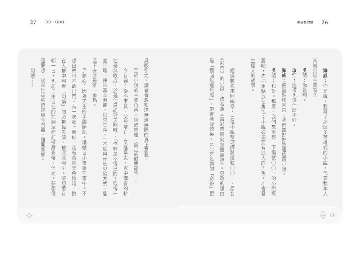 在「小說整理師」的協助下,李雲寶開始書寫小說《彩帶》,並在過程中不斷與這三位「小說整理師」對話。閱讀這段情節的過程,讓我聯想到自己在利用AI輔助創作時的感受,就像是在開盲盒,永遠充滿意想不到的結果。