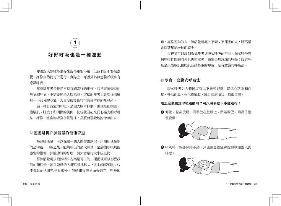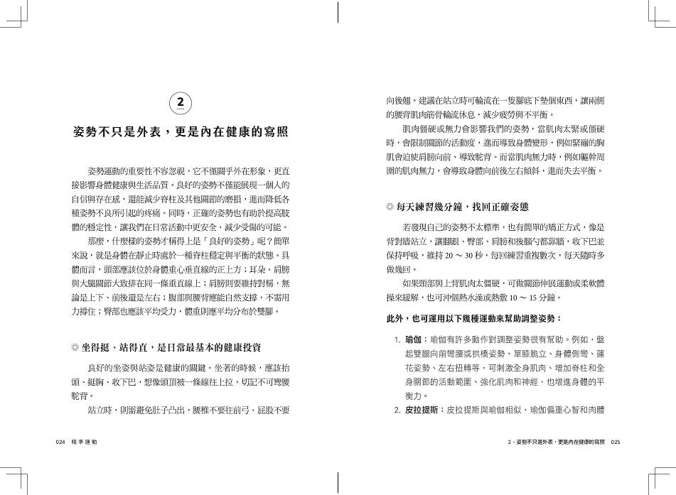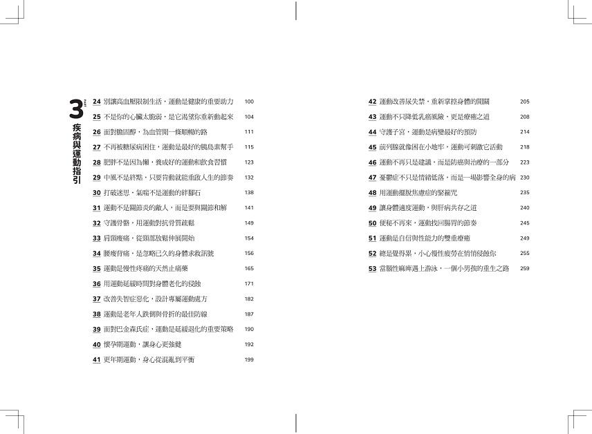 全書共分四部分:第一章說明建立運動與健康的基本觀念;第二章介紹從呼吸、心肺、肌力到身體協調力的9種基本運動;第三章推薦14種有益健康的活動;第四章提供超過30種常見疾病與身體問題的運動建議。不論你是血壓偏高、血糖不穩、關節疼痛、焦慮失眠,甚至是罹患癌症、巴金森氏症或經歷中風,都能找到具體、溫和且可執行的運動策略。