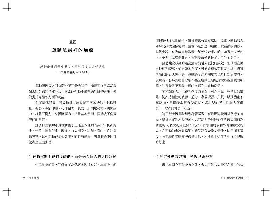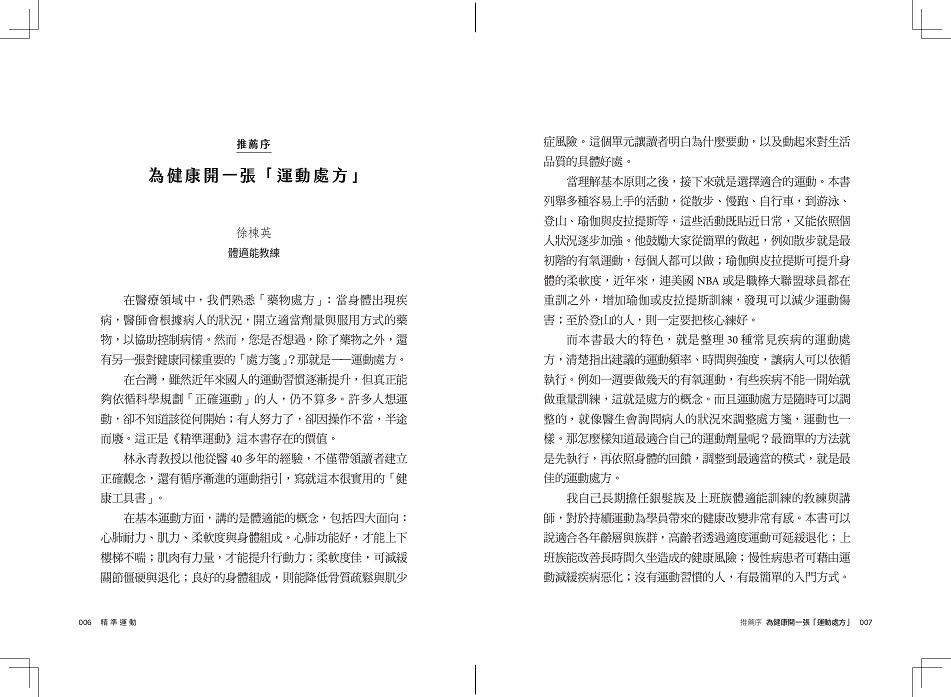 本書適合各年齡層與族群,不僅會改變您對運動的看法,更可能改變您的生活方式,也是醫生為病人開立運動處方很好的參考指南。要活就要動,而動得精準,就能活得更健康。──徐棟英 體適能教練