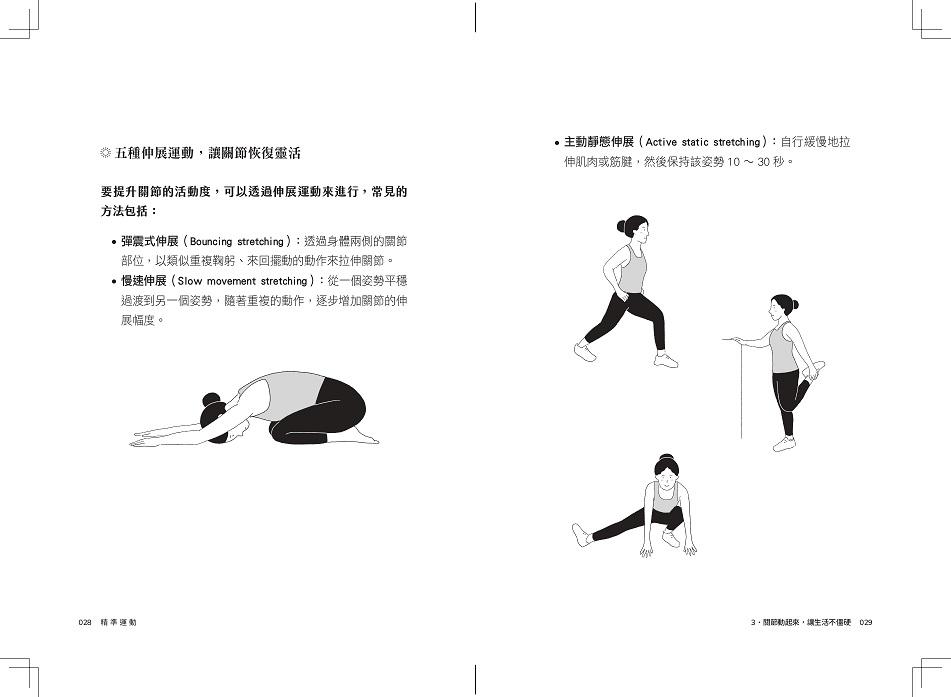 在基本運動方面,講的是體適能的概念,包括四大面向:心肺耐力、肌力、柔軟度與身體組成。心肺功能好,才能上下樓梯不喘;肌肉有力量,才能提升行動力;柔軟度佳,可減緩關節僵硬與退化;良好的身體組成,則能降低骨質疏鬆與肌少症風險。這個單元讓讀者明白為什麼要動,以及動起來對生活品質的具體好處。