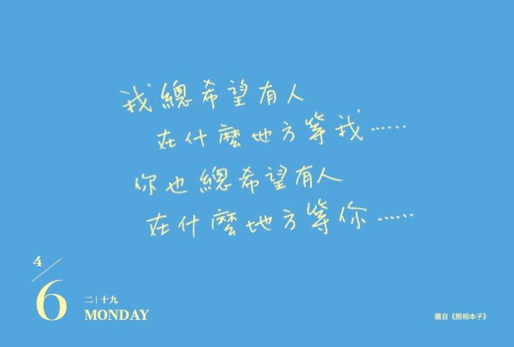 在不特定的日子裡,日曆畫面的主圖會用幾米手寫字來表現,由幾米寫下繪本裡的經典佳句。但別擔心,這頁日曆的背後,就會有對應的幾米畫作。這是這一年度幾米年曆的特別設計。