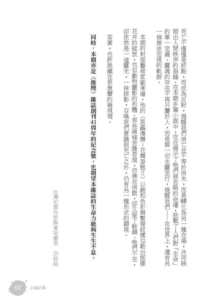 同時,本期亦是《推理》雜誌創刊41周年的紀念號,也期望本雜誌的生命力也能夠依舊生生不息。