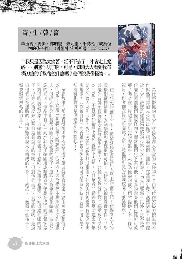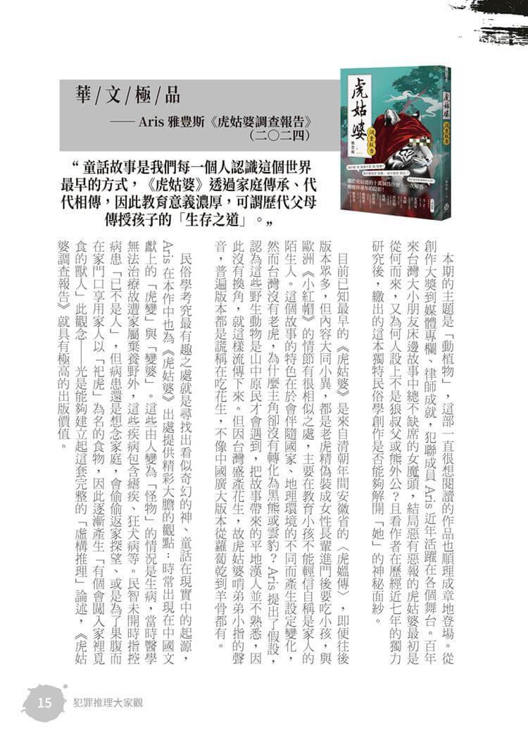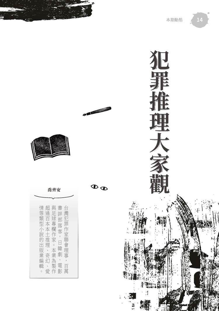 本期專欄以「動植物」為題,帶來跨越民俗、社會與當代教育的深度思索。從百年來的虎姑婆傳說,到少年犯罪的真實映照,再到女性處境與社會制度的批判,透過評論、書評與文化觀察,揭示犯罪推理不僅是謎團破解,更是對人性與制度的直面凝視。每篇文字都如鏡子般折射出台灣與世界的現實,拓展讀者對推理文學的視野與理解。