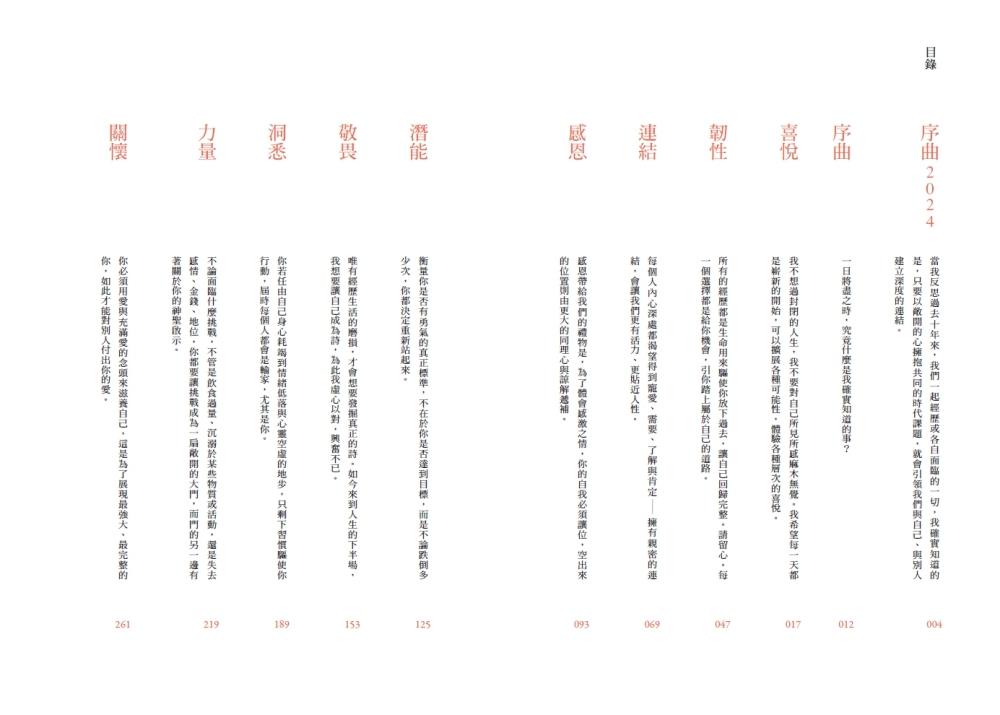 增訂版新增〈序曲,2024〉、〈關懷〉兩部分,全書透過九個主題,歐普拉細數自己人生閱歷,提醒我們,所有的精采,都建立在對每個呼吸的真誠以待: