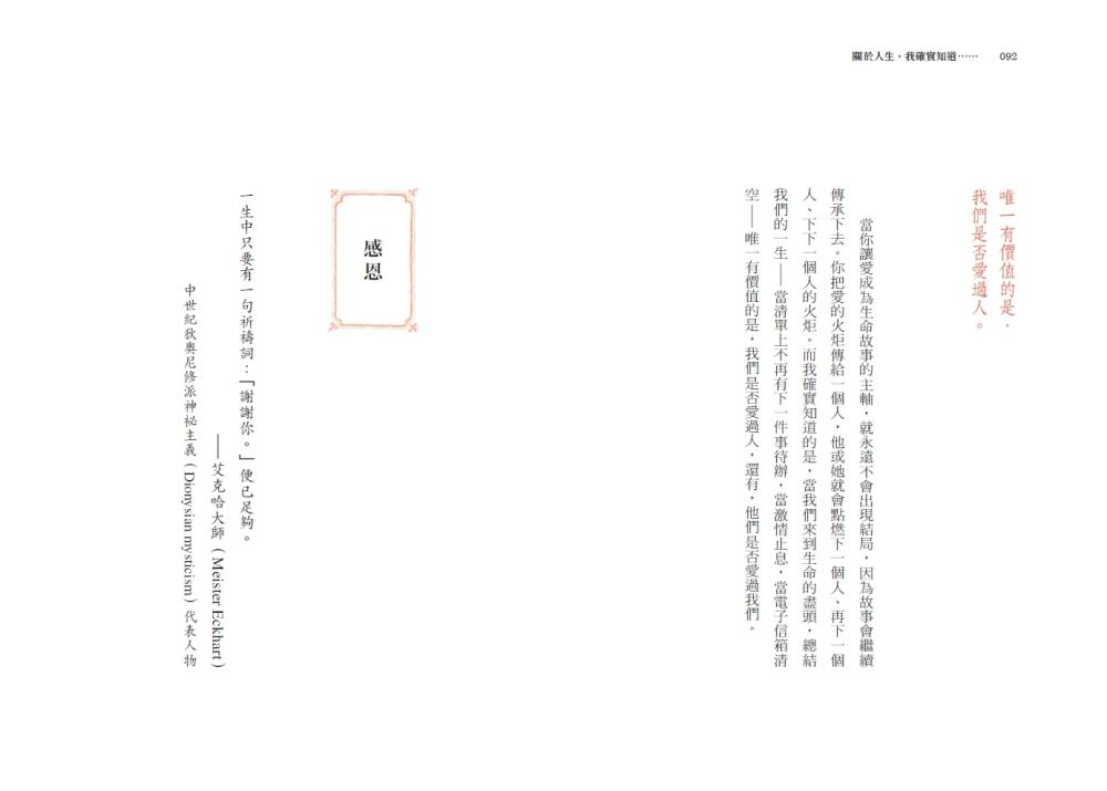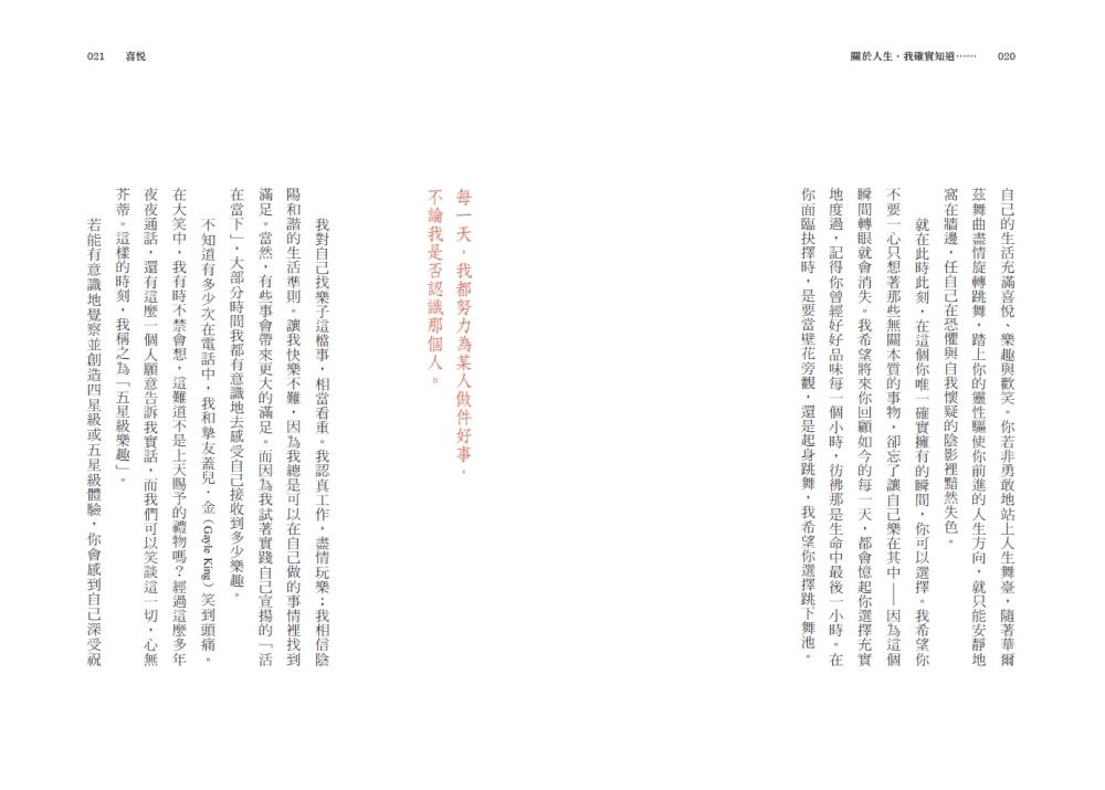 《關於人生,我確實知道……》剛出版時,我接近六十歲。當時,我覺得很不可思議,我竟然能夠邁入六十大關,還能告訴別人我深信自己的最大成就是從未關閉心房。我心懷感恩地意識到,我始終保持虔誠,懷抱希望,敞開心胸去看人們好的那一面,不論他們是否對我展現出壞的一面。我保持開放的態度,相信不論攀登多困難的關卡,永遠都會有辦法讓光照進來,點亮前方的路。
