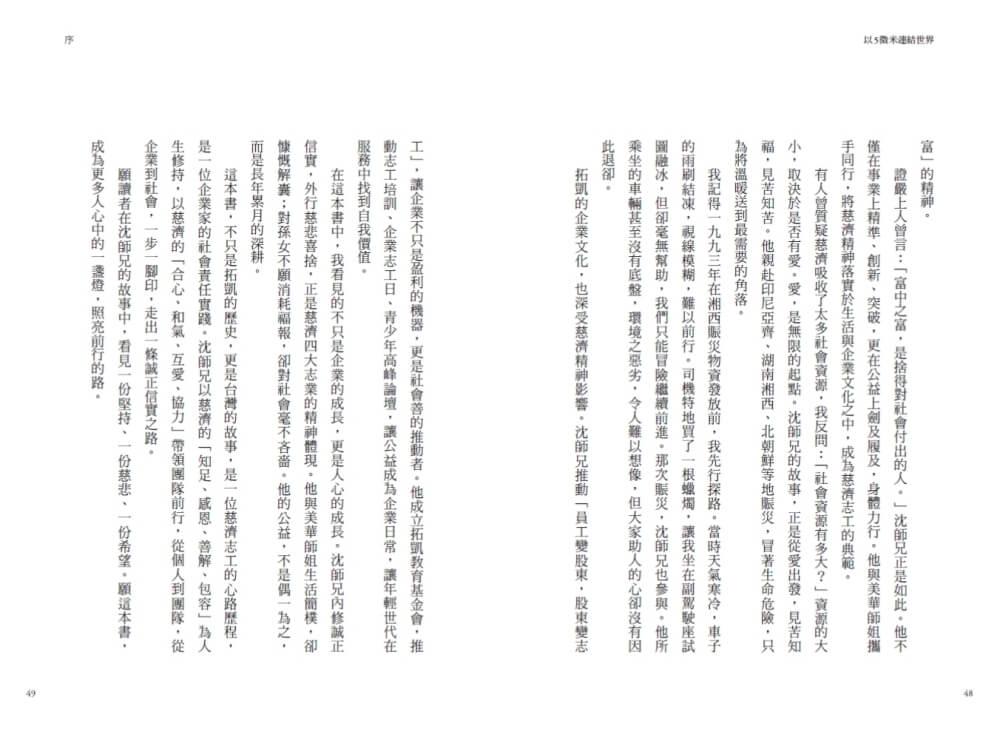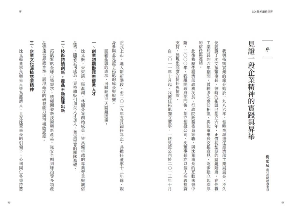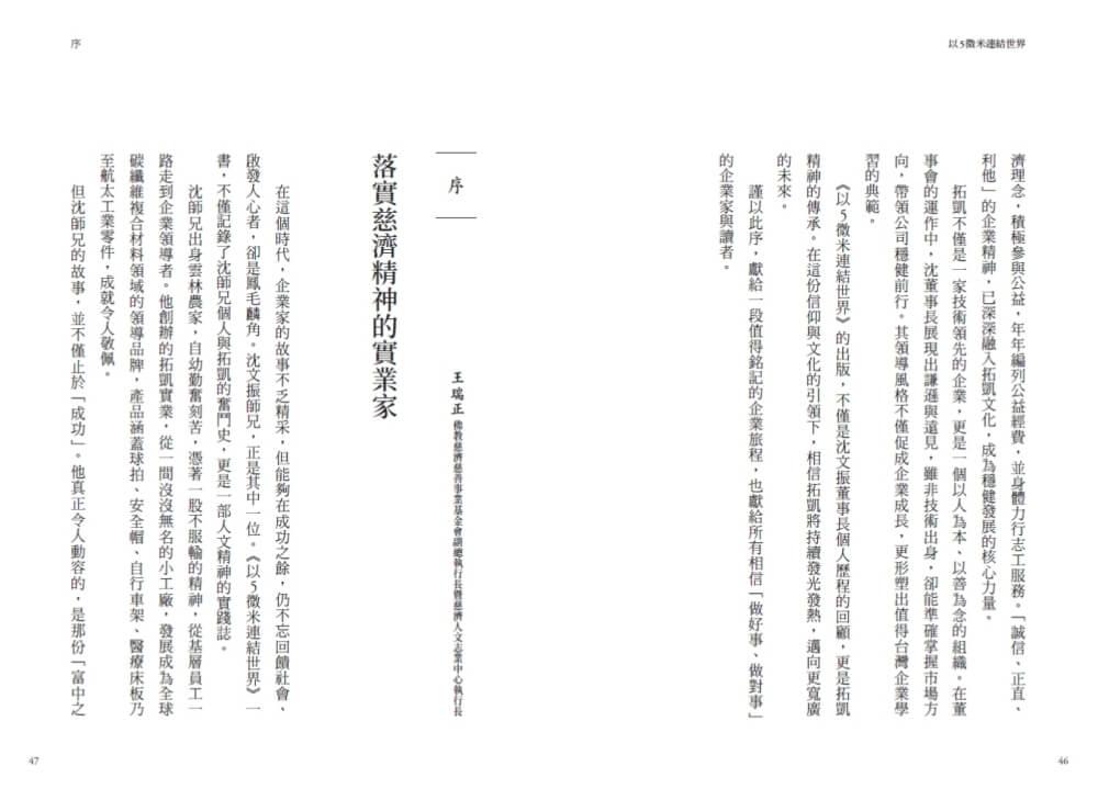 在這個時代,企業家的故事不乏精采,但能夠在成功之餘,仍不忘回饋社會、啟發人心者,卻是鳳毛麟角。沈文振師兄,正是其中一位。以《5微米連結世界》一書,不僅記錄了沈師兄個人與拓凱的奮鬥史,更是一部人文精神的實踐誌。