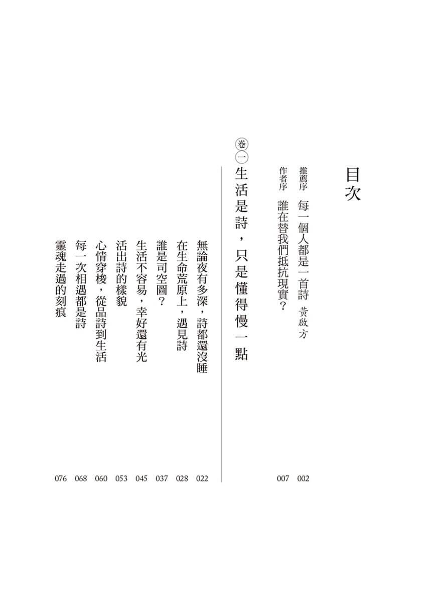 本書的書名和大小標題,都會讓人心中一動:「有人,替我們抵抗現實」、「生活是詩,只是懂得慢一點」、「詩是微光,細細品來剛剛好」、「無論夜有多深,詩都還沒睡」、「生活不容易,幸好還有光」……每一句都是詩句。