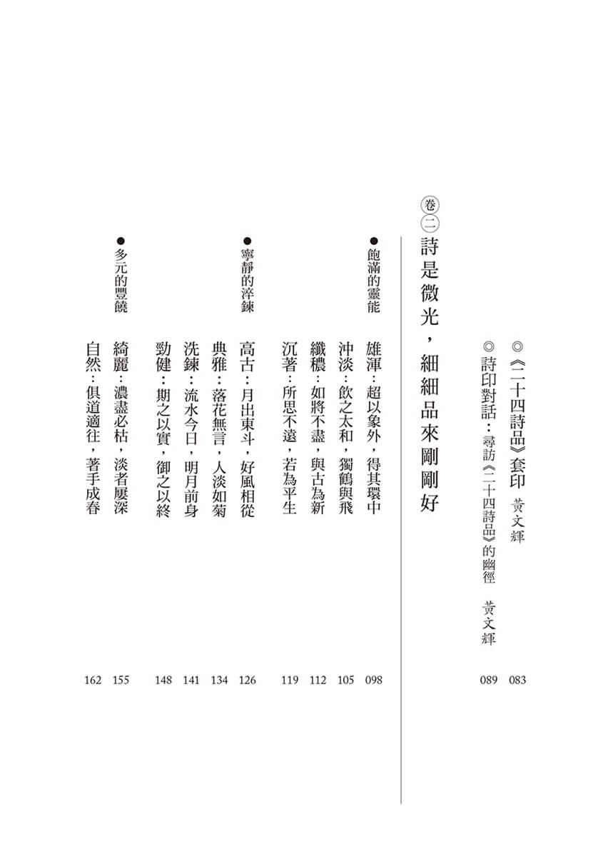 這本書,可以放在床頭,睡前翻一、兩首,濾一濾生活渣滓;也可以風翻哪頁讀哪頁,當作和生命相遇的「Sign」,有點神祕,也有點樂趣;更可以擺在工具書堆裡,因應各種不同的需要,選材裁句,以別緻絕美對抗AI世紀的強勢量產;最有趣的是,二十四品就像星座,對應出這世間的每一個人,找出自己的品,咀嚼各種情味,一如星子發亮。