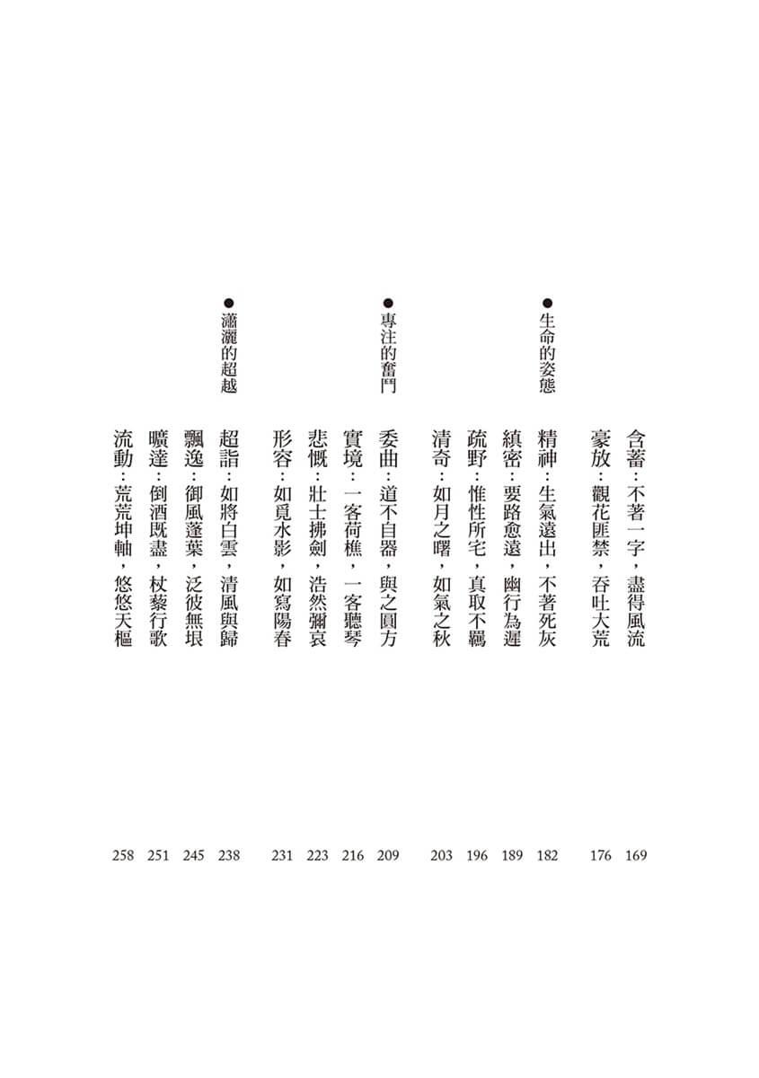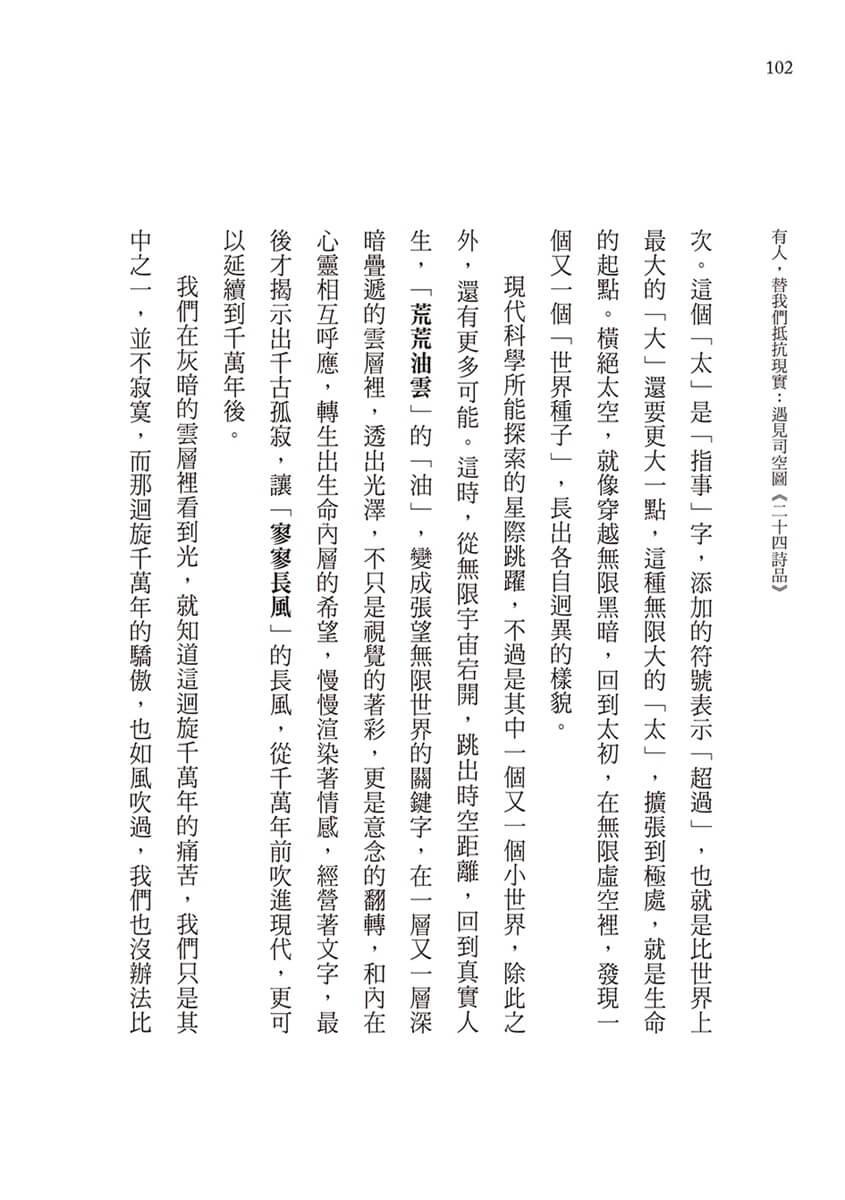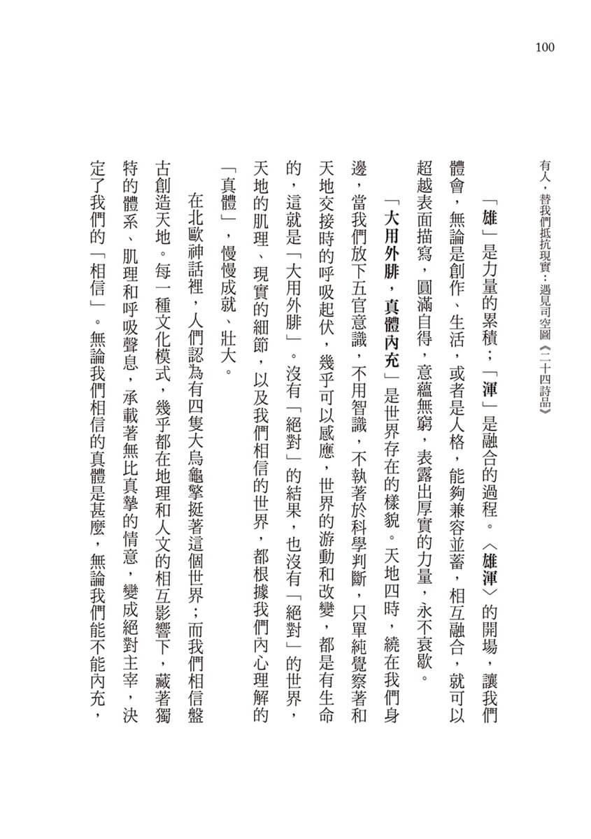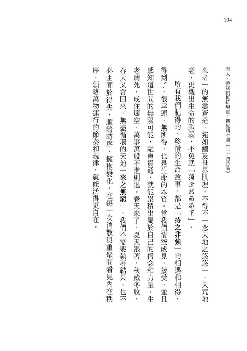 司空圖以一個人的努力,為戰亂流離的身不由己,抵抗現實;《二十四詩品》的多元探索,為疲憊厭倦的我們,抵抗現實。我們可以把這本書放在床頭,睡前翻一、兩首,濾一濾生活渣滓;也可以翻開哪頁讀哪頁,當作和生命相遇的「Sign」,有點神祕,也有點樂趣;更可以擺在工具書堆裡,因應各種不同的需要,選材裁句,以別緻絕美對抗AI世紀的強勢量產。
