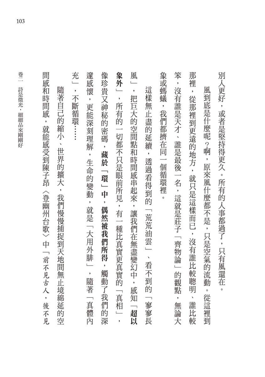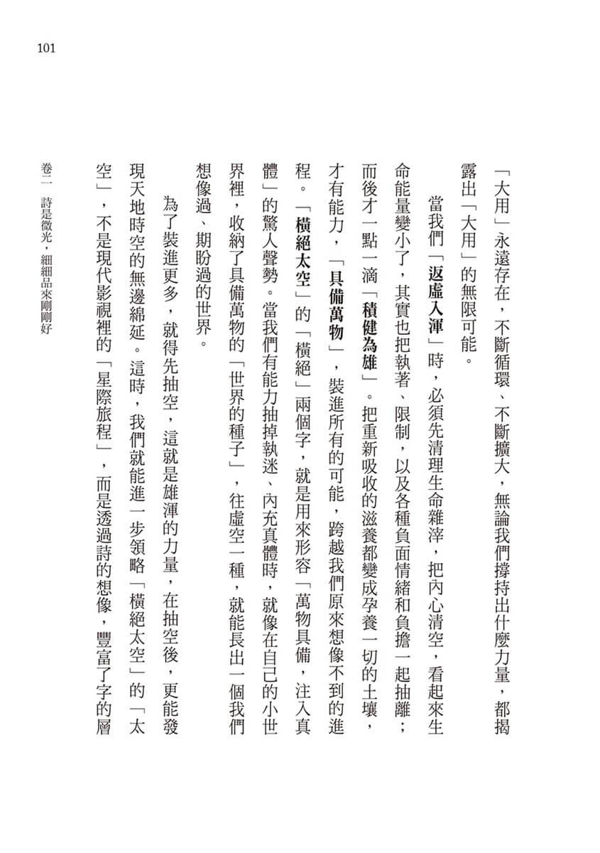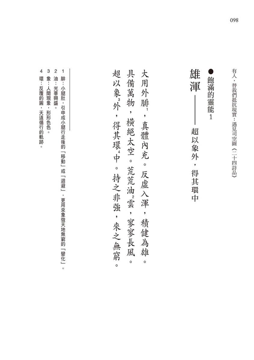 這些凝鍊又有趣的文字,擴大文學感受和聯想,每句四言詩,都變成自由活用的「成語」;如果把兩句詩連起來,四個字的成語就晉級變身成八個字的「名句」。回到目錄頁,對照卷二的標題深入領略,從最初的「超以象外,得其環中」、「飲之太和,獨鶴與飛」……到最後的「倒酒既盡,杖藜行歌」、「荒荒坤軸,悠悠天樞」,如果多一點熱情,從每首詩摘錄出自己喜歡的任何八個字,不但理解了古今文人創作的典故,同時也安慰了在現實生活裡,有點疲倦、有點失落、卻又努力堅持信念的每一個人。