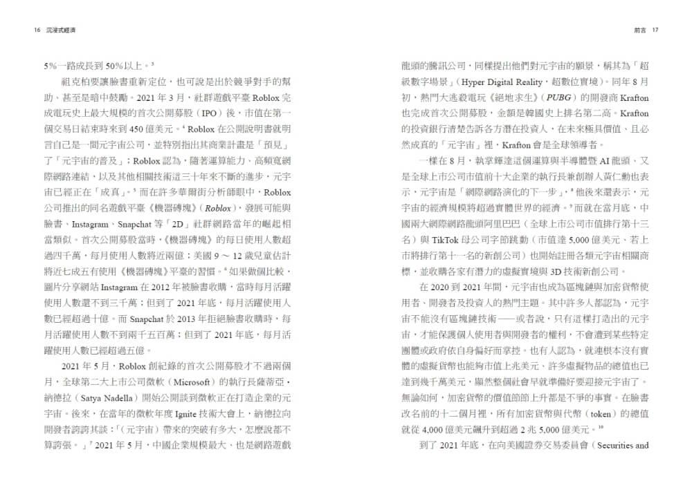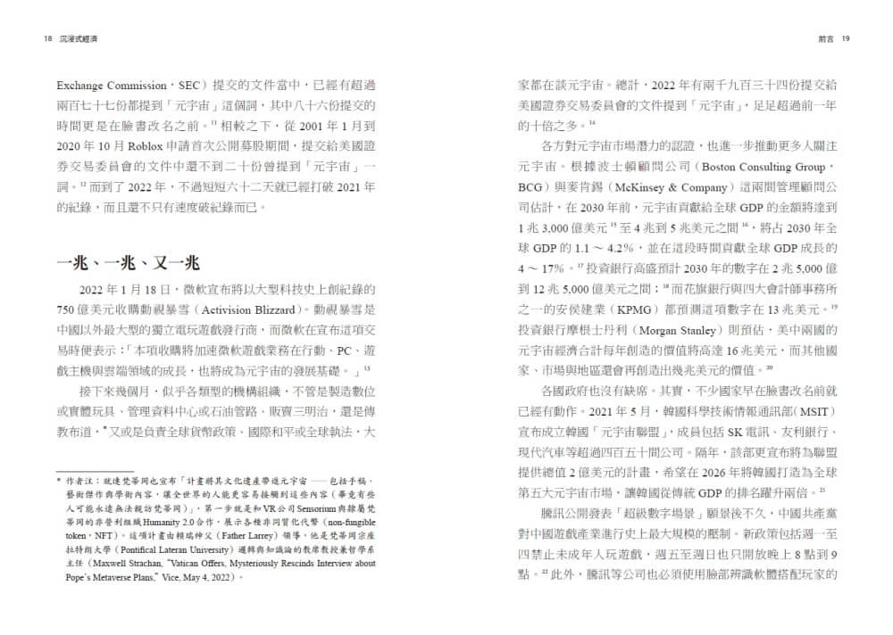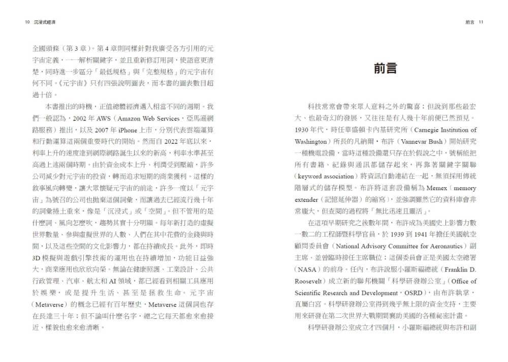 本書推出的時機,正值總體經濟邁入相當不同的週期。我們一般認為,2002年AWS(Amazon Web Services,亞馬遜網路服務)推出,以及2007年iPhone上市,分別代表雲端運算和行動運算這兩個重要時代的開始。然而自2022年底以來,利率上升的速度達到網際網路誕生以來的新高,利率水準甚至高過上述兩個時期。由於資金成本上升、利潤受到壓縮,許多公司減少對元宇宙的投資,轉而追求短期的商業獲利。這樣的敘事風向轉變,讓大眾懷疑元宇宙的前途,許多一度以「元宇宙」為號召的公司也拋棄這個詞彙,而讓過去已經流行幾十年的詞彙捲土重來,像是「沉浸式」或「空間」。但不管用的是什麼詞、風向怎麼吹,趨勢其實十分明顯。每年新打造的虛擬世界數量、參與虛擬世界的人數、人們在其中花費的金錢與時間,以及這些空間的文化影響力,都在持續成長。此外,即時3D模擬與遊戲引擎技術的運用也在持續增加,功能日益強大,商業應用也欣欣向榮。無論在健康照護、工業設計、公共行政管理、汽車、航太和AI領域,都已經看到相關工具應用於娛樂,或是提升生活、甚至是拯救生命。元宇宙(Metaverse)的概念已經有百年歷史,Metaverse這個詞也存在長達三十年;但不論叫什麼名字,總之它每天都愈來愈接近、樣貌也愈來愈清晰。