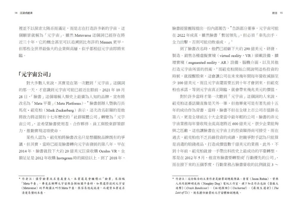 至於本書其他更新內容,則是反映讀者的意見回饋與其他想了解的內容。本書加入Epic Games與Oculus VR等公司的詳細創立歷史,也探討為什麼元宇宙議題從2021年開始躍上全國頭條(第3章)。第4章則同樣針對我廣受各方引用的元宇宙定義,一一解析關鍵字,並且重新修訂用詞,使語意更清楚,同時進一步區分「最低規格」與「完整規格」的元宇宙有何不同。《元宇宙》只有四張說明圖表,而本書的圖表數目超過十倍。