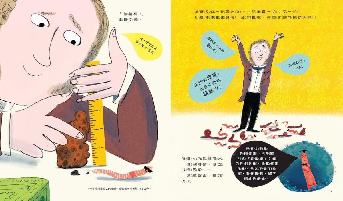 這本書以生動活潑的方式,呈現查爾斯・達爾文對自然界的「第二大」興趣──蚯蚓的研究。書中的故事不僅充滿啟發也極具娛樂性,生動的文字搭配幽默的對話,再加上細節恰到好處的插圖,讓故事更有層次,同時突顯出達爾文研究的重要性。插圖中的人物豐富多元、充滿活力。整本書讀來不但引人入勝,更讓人重新認識蚯蚓、用全新的眼光讚賞這神奇的小生命!──《科克思書評》好評推薦