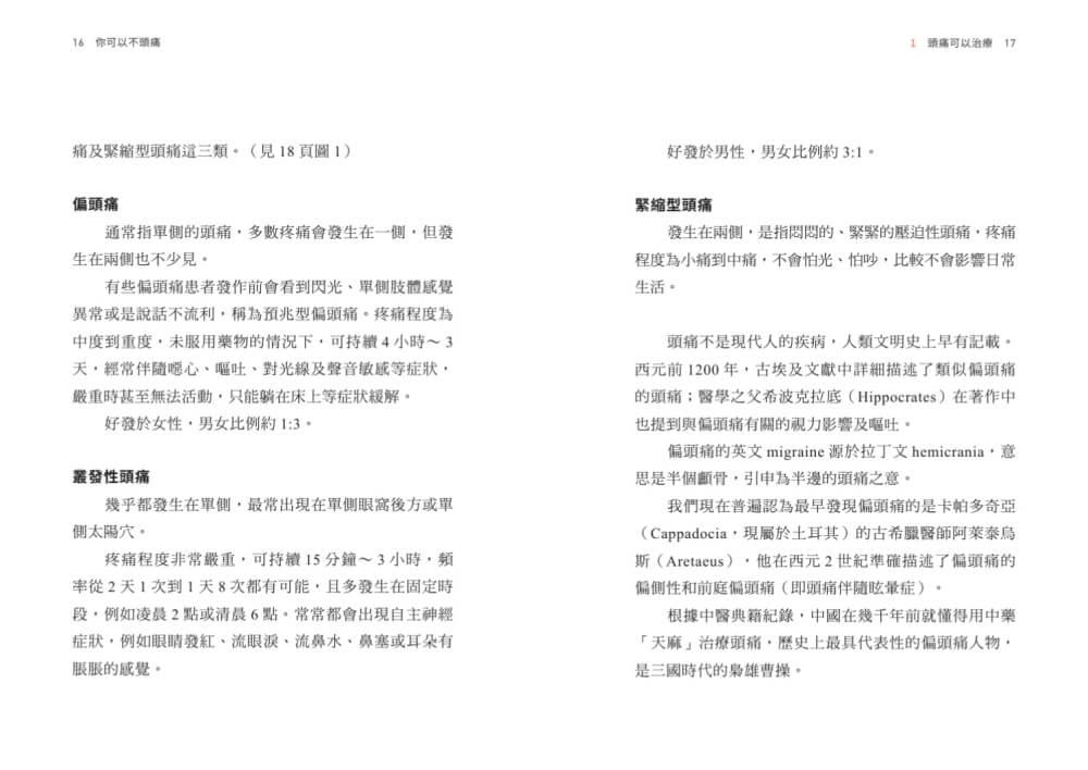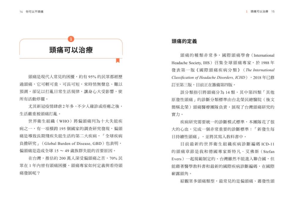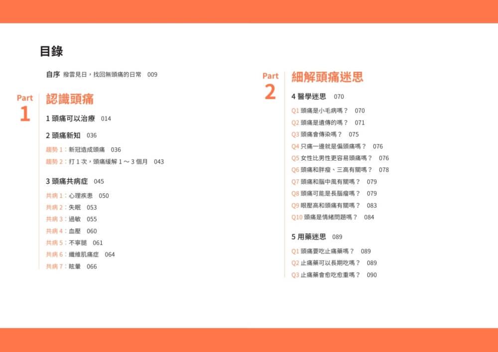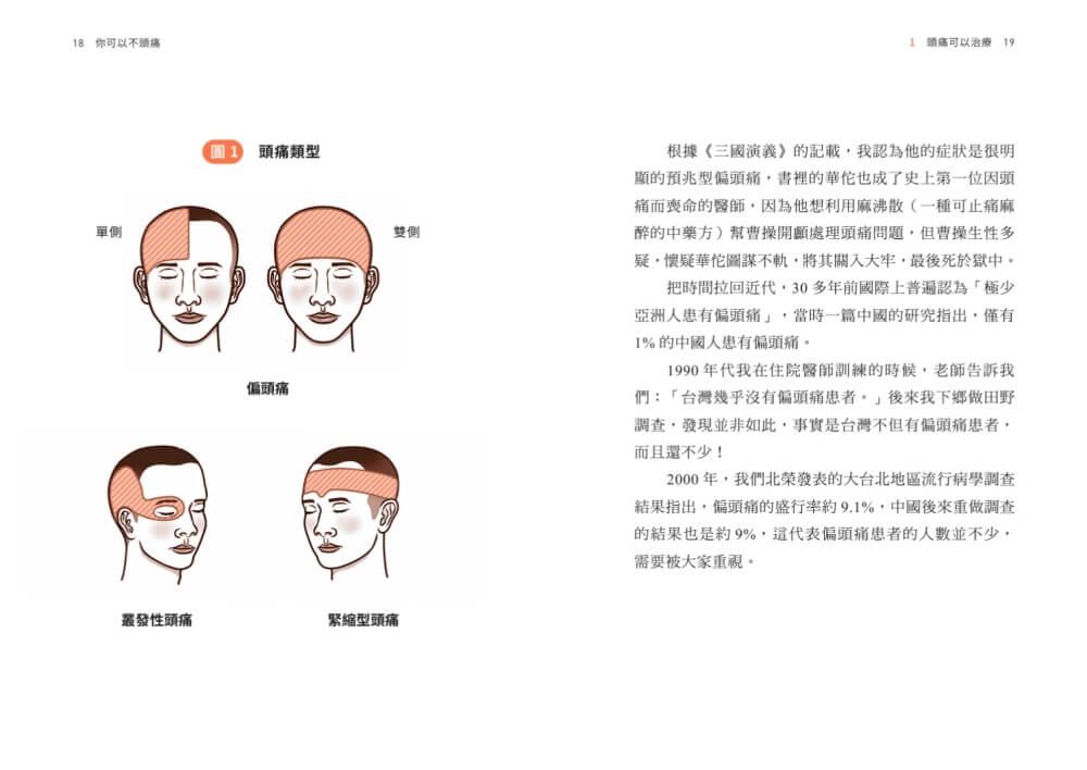 撰寫這本書的過程,是再一次梳理我多年行醫經驗的過程,我希望能用最淺顯易懂的文字,將艱澀的醫學知識轉化為實用的建議,讓讀者能產生共鳴,並從中受益。無論你是長期為頭痛所苦,或是想更深入了解頭痛的成因與治療,我都希望能透過這本書,為你點亮一盞明燈。