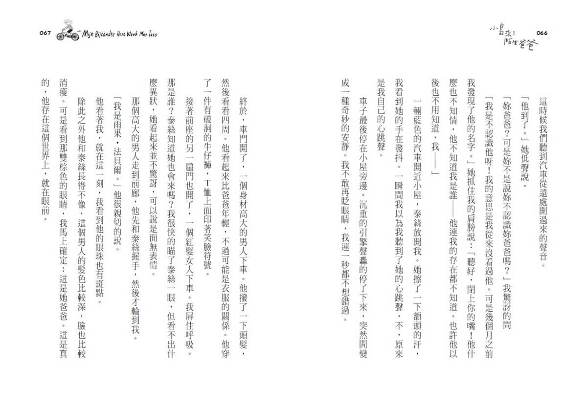 腳踏車飛快的衝到咖啡色小屋的門前。那是一棟平頂的小屋,窗戶拉上了有大花圖案的窗帘。泰絲跑上木梯,打開門,像一陣旋風吹進屋子,接著打開窗戶、把鬱金香插進花瓶、紙張放在桌上,然後回到前廊,站在我旁邊。