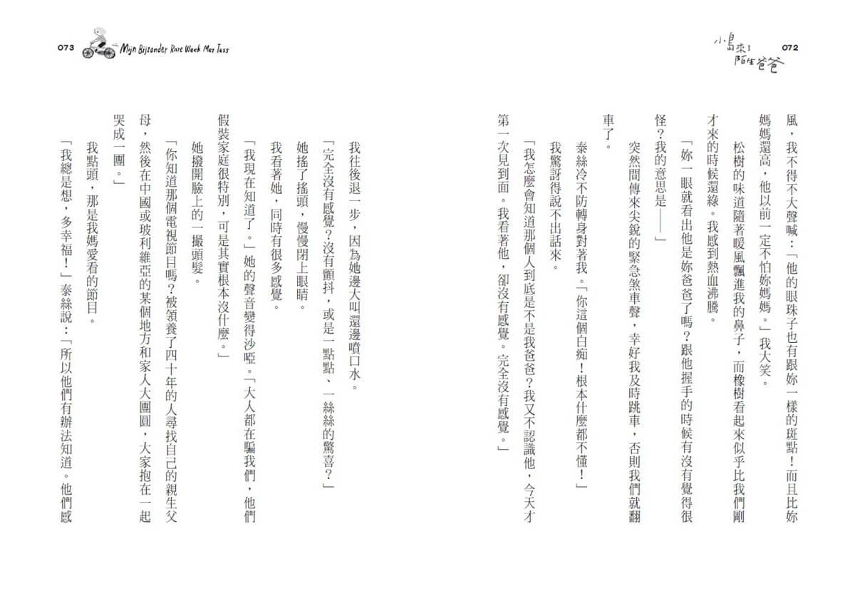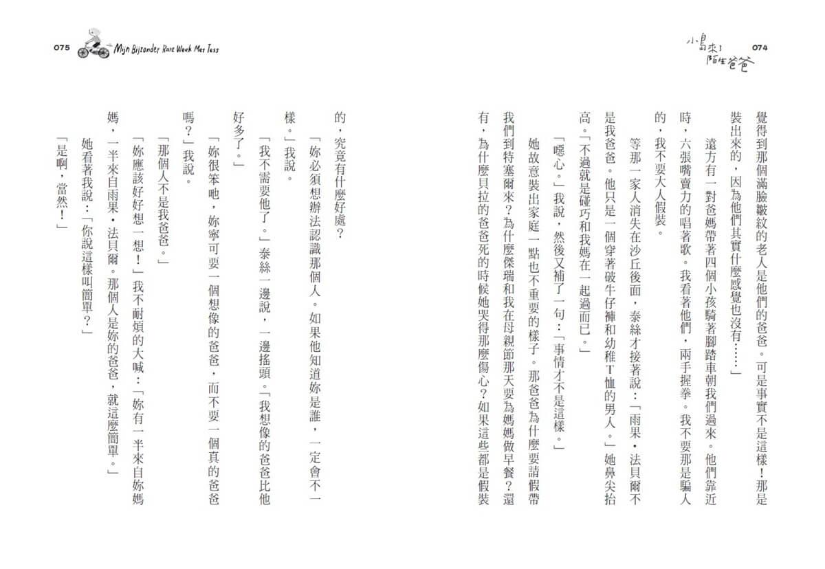然後,當我讀到山姆遇到泰絲,發現泰絲沒有爸爸,而且泰絲的媽媽竟然直接告訴女兒:「這樣兩個人過日子很好,我們不需要男人」、「就是因為女人太常說對不起,才會被小看」時,我更加確定,這本書大概不會是出自於觀念保守的亞洲,故事背景一定是在一個女性意識強烈、兩性平等,而且社會福利健全的地方,才能讓女人能夠勇敢的說出這樣「有氣魄」的話,並且一肩挑起撫養女兒的責任。