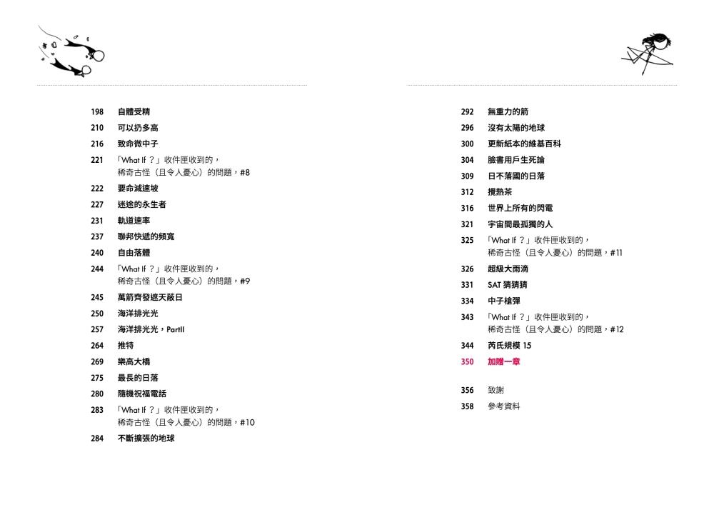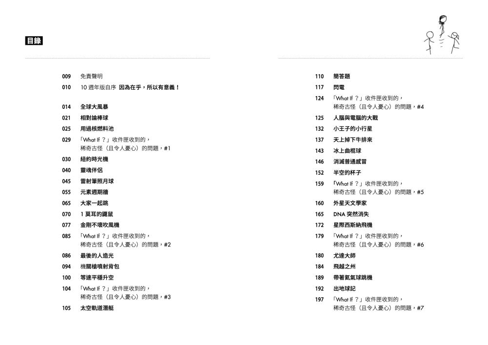 自《如果這樣,會怎樣?》首度出版以來,已經10年了。書上集結了一大堆荒謬的假設性問題,以及解答,這些問題都是大家投書到我的網站來問我的。在網站上,我除了充當瘋狂科學家的「親愛的XX大師」之外,還畫火柴人網路漫畫──xkcd。