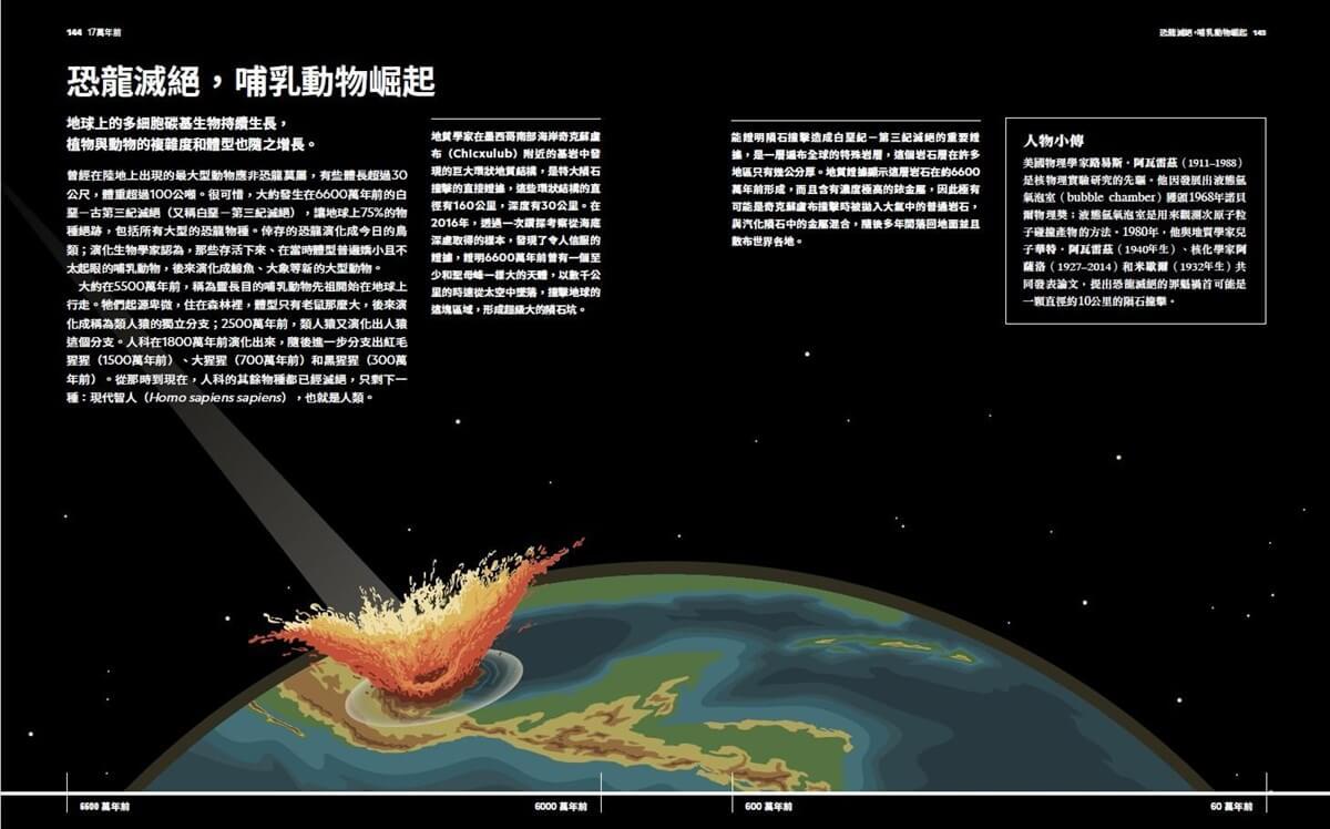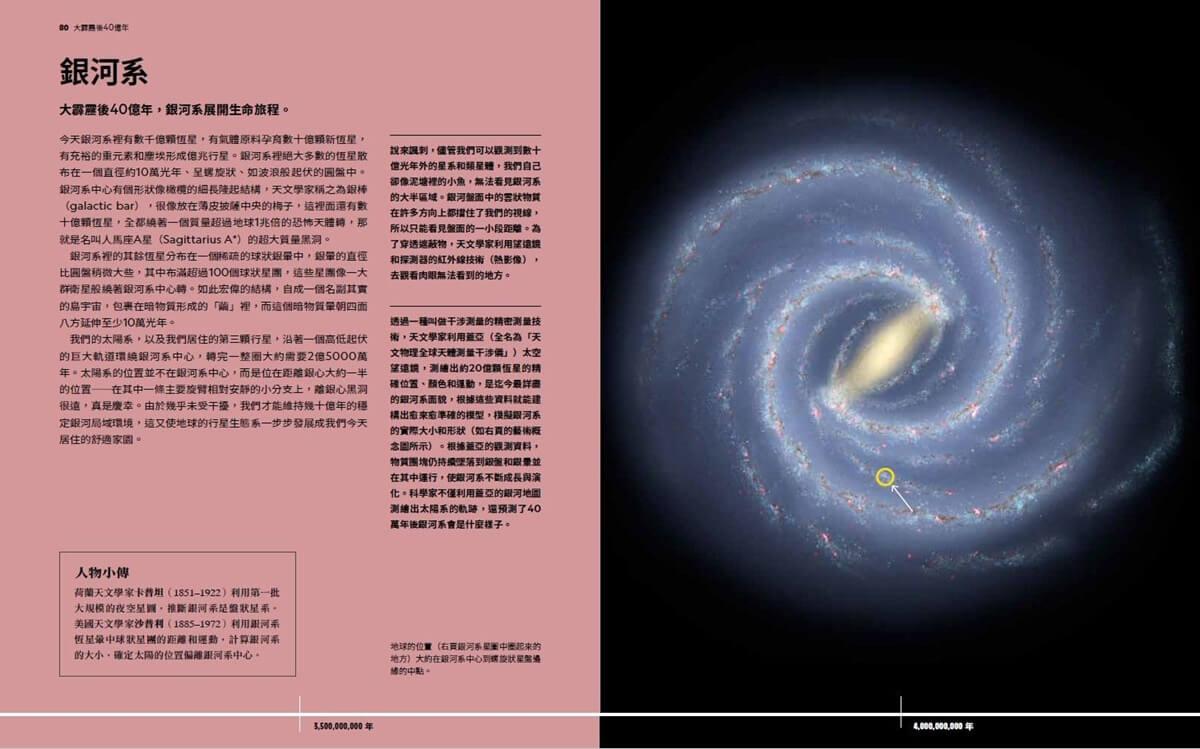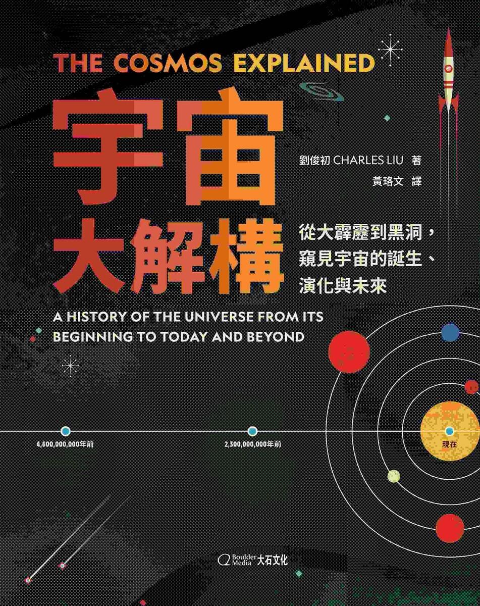 隨著書頁,你會探索恆星和星系的誕生、太陽系的形成,了解地球上的生命如何演化出來,宇宙在遙遠未來的命運,每頁下方都有時間軸,讓你隨時知道自己來到哪個時刻。天文物理學家劉俊初教授用淺顯易懂的文字、簡單明瞭的插圖和瑰麗絢爛的天文照片,娓娓道出這部兼具宇宙歷史和宇宙科學的精采故事。