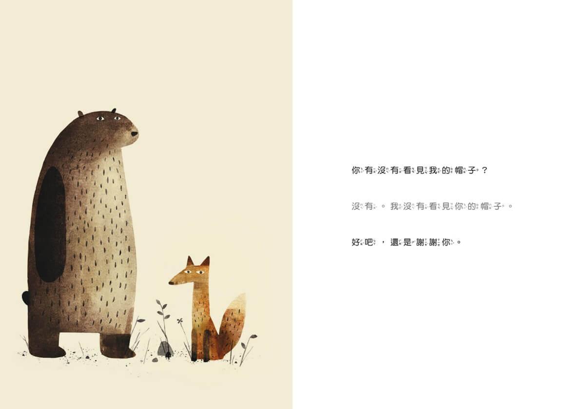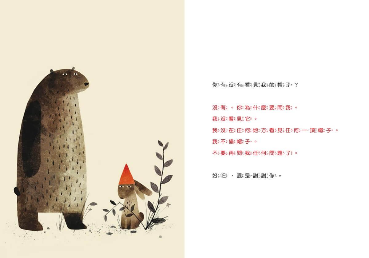既然是帽子系列,我們就先來談帽子吧!總是戴著帽子的作者雍·卡拉森選擇以帽子為主題發展似乎很合理。不過,他在接受訪問的時候談到,使用帽子有視覺上的考量。一方面,動物戴帽子的造型很有趣,再則,以失去帽子尋找帽子的過程,帶動熊主角的情緒比較容易讓孩子理解。當然,他也提到,若設定掉了金錢或是食物,比較容易引發其他複雜的聯想,但是找帽子相對輕巧且容易處理。