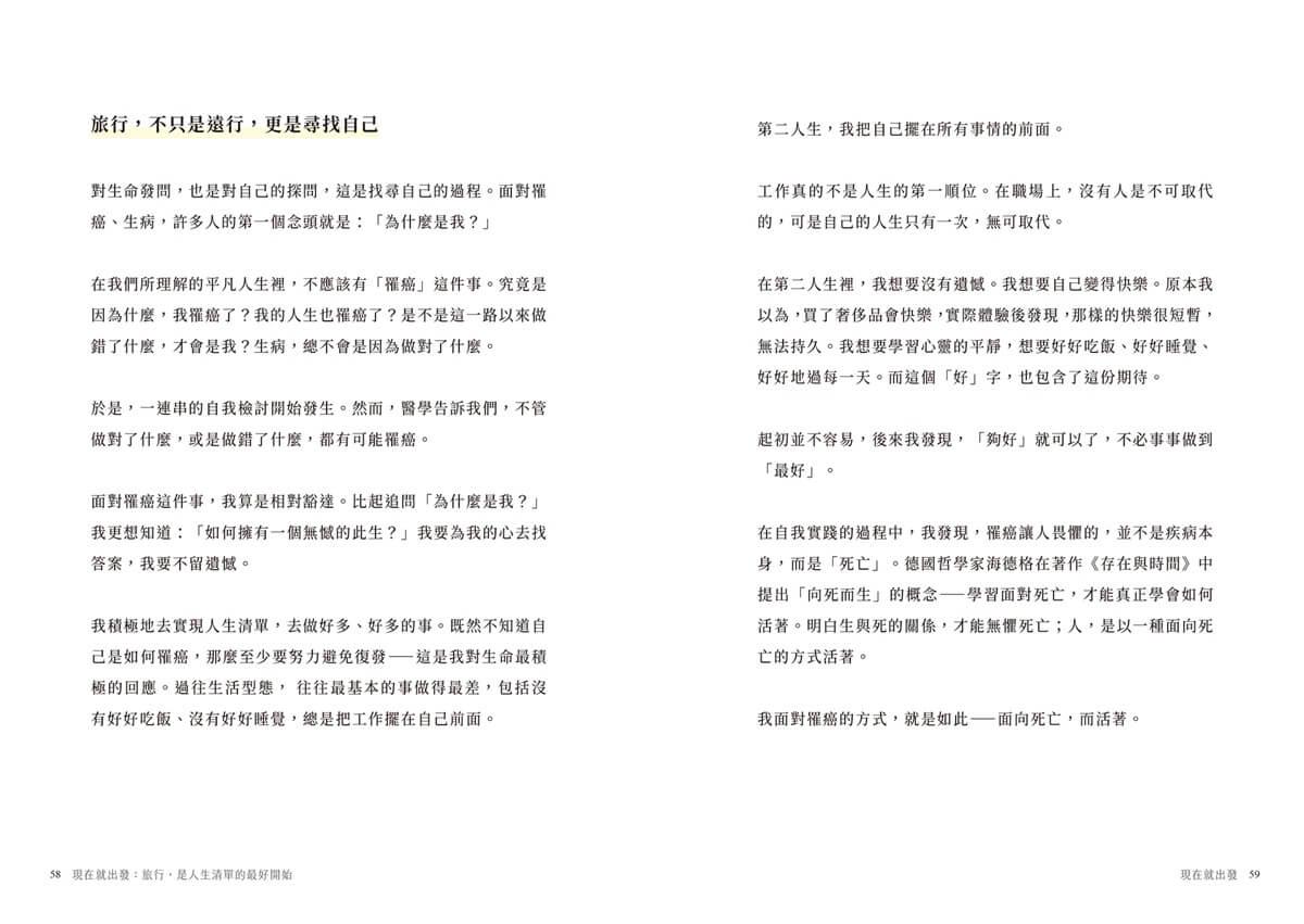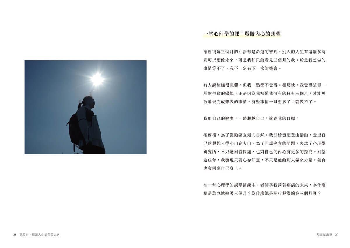 三十歲的禮物是癌症,40歲的禮物是一個自在自適的人生。《現在就出發,別把人生清單留到以後》這是我走過十年來,最深刻的體悟,也許是疾病的時間感不一樣,也許是向死而生,生命有了新的可能。
