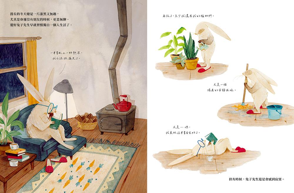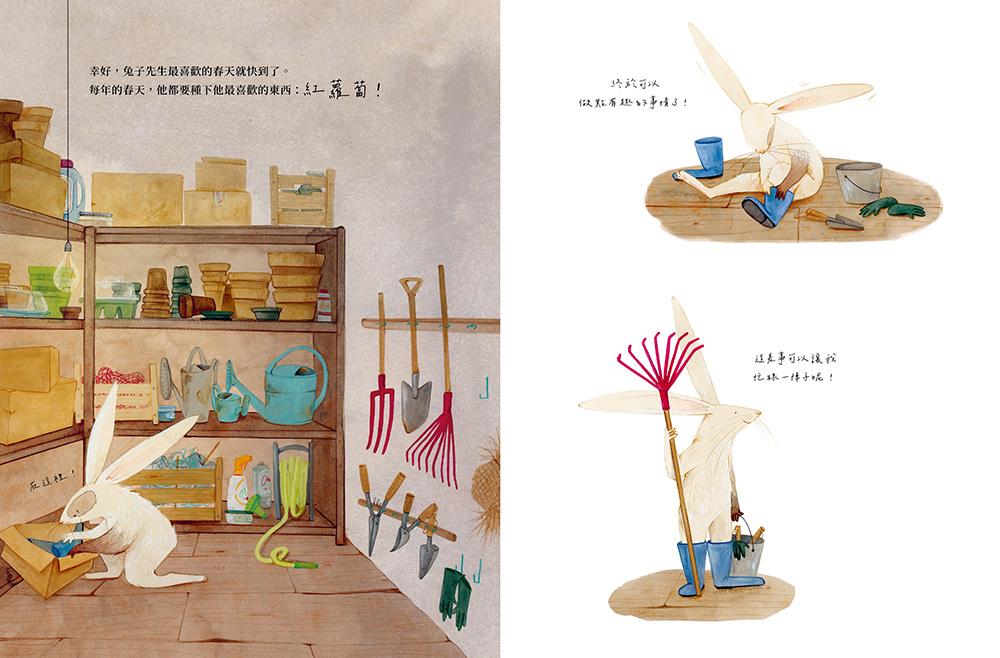 兔子先生習慣一個人獨自生活,喜歡閱讀、園藝這些靜態的活動,雖然有的時候有點寂寞,但他可以看書排遣寂寞。春天來臨時,兔子先生灑下240顆紅蘿蔔種子,他很用心地照顧這些紅蘿蔔,跟他們聊天、唱歌、灌溉。有一天,兔子先生發現有一棵紅蘿蔔長得特別高大,他用力拔呀拔的,竟然拔出了一個會說話、會走路的紅蘿蔔。兔子先生想將紅蘿蔔帶去園藝店退貨或送到超市,但都失敗了。無奈的兔子先生只好和紅蘿蔔一起生活。