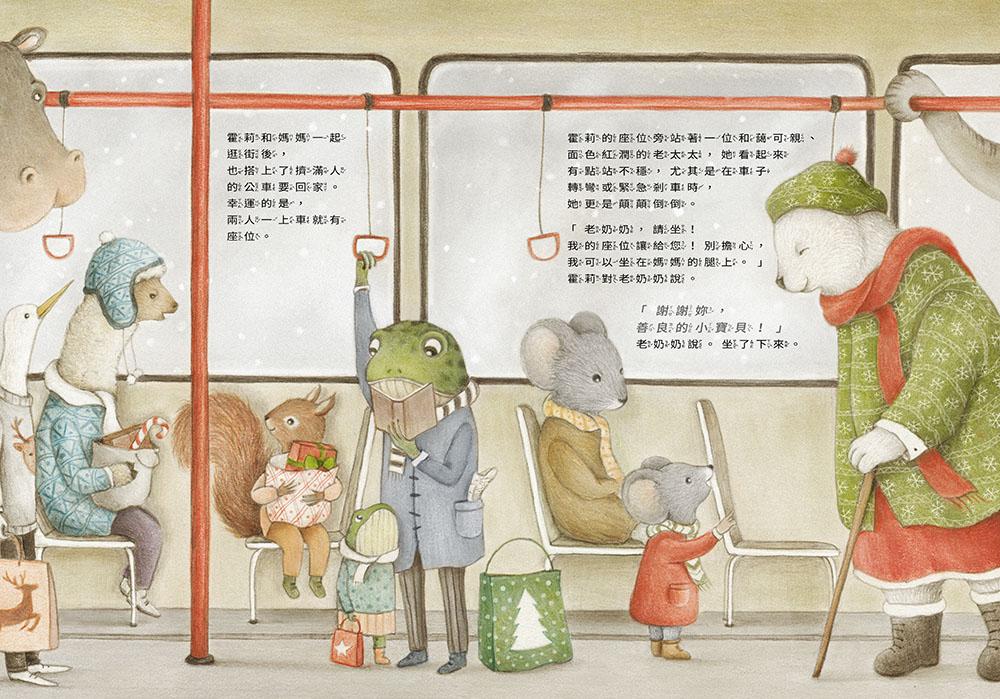 聖誕節前夕,所有人都忙著上街採買禮物,趕著回家過節。小老鼠霍莉和媽媽買完禮物後,還要趕著去郵局,霍莉寫了一封信要給聖誕老公公,信裡寫著她今年想要的聖誕禮物。霍莉和媽媽要趕在郵局打烊前把信寄出去。車上、路上,滿滿的人潮,擠呀擠的,她們的時間所剩不多了,因為郵局已經快要關門休息了……但是,善良的霍莉即使自己趕時間,還是不忘在路上幫忙那些需要幫助的人:首先,她在車上讓座給一位老奶奶,看到哭鬧不休的小嬰兒,還幫著逗笑安慰,把自己的三明治分給流浪漢老人,幫匆忙的送貨員撿拾掉在路上的包裹……每一次霍莉停下來幫助別人時,媽媽總是緊張萬分的提醒她:「霍莉!快一點!我們要來不及了!」小讀者們看到這些過程,一定也是替霍莉緊張的,媽媽的一聲聲催促,增加了閱讀的緊張感與樂趣,同時也讓人感受到霍莉在付出的過程中的喜悅。這個故事營造出一種強烈的參與感,讀來既緊張又溫暖。