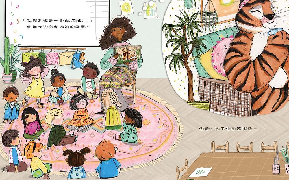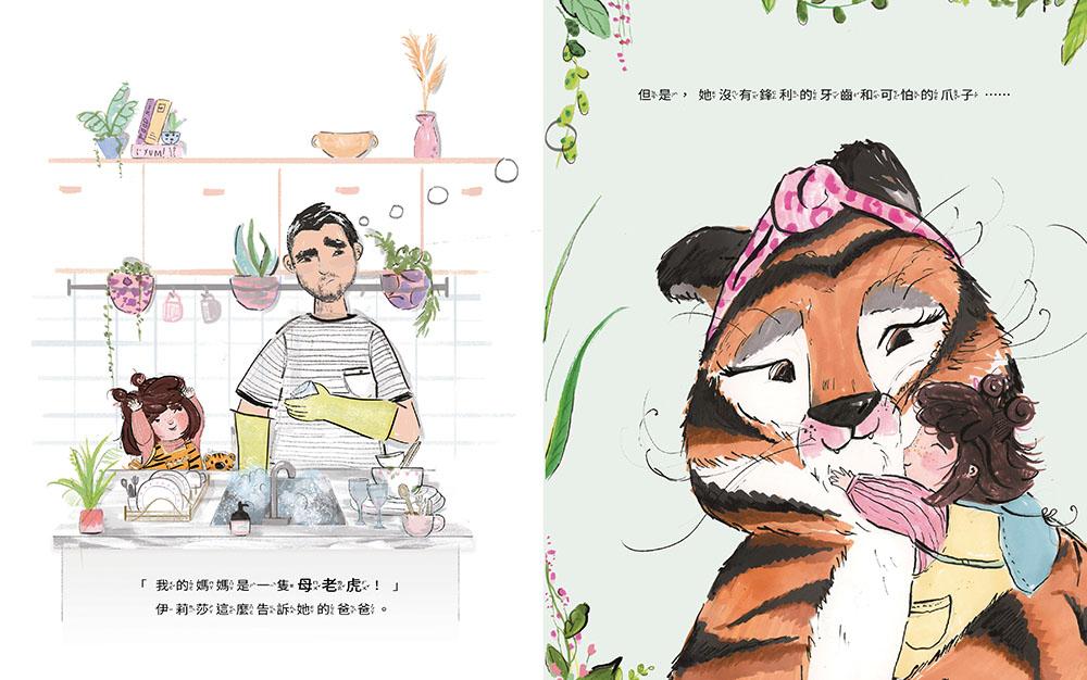 小女孩童言童語地告訴所有人說:「我媽媽是隻母老虎!」媽媽很兇嗎?媽媽聽了也覺得很奇怪! 媽媽想:我沒有鋒利的爪子,也不住在叢林裡,我也不獵食啊!我怎麼會是母老虎?原來是媽媽身上的妊娠紋讓小女孩覺得媽媽是隻老虎!像老虎斑紋的妊娠紋,是媽媽辛苦生下孩子的痕跡,是愛的印記!