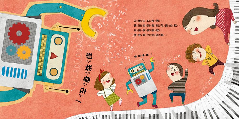 明天開始要上幼稚園的小男孩,悶悶不樂地坐在沙發上,跟他的許多玩具好夥伴們訴苦,他不想去,媽媽和喜歡的玩具都待在家,為什麼要去幼稚園?玩具們一聽小男孩的話,爭先恐後講述自己聽說在幼稚園的有趣活動,紛紛自告奮勇說想去幼稚園!機器人嘰哩嘰哩的舉起手臂說,聽說去幼稚園可以學唱歌跳舞,他想跟朋友們坐在一起聽有趣的故事;超人五兄弟挺身說,聽說去幼稚園能跟朋友玩捉迷藏,他們想教朋友如何變身;恐龍玩偶也很興奮,因為聽說去幼稚園有好吃的午餐,還可以動手學做三明治;泰迪熊也附和說想去幼稚園,因為聽說幼稚園會去動物園就能看到真正的熊,還會公園郊遊。小男孩的玩具們圍成一圈,生動的比手畫腳,表示對幼稚園的嚮往,讓小男孩也對去幼稚園充滿期待,最後叉著腰充滿信心的說:「那我也要去幼稚園!」幼稚園這麼多好玩的活動,才不能少了他呢!