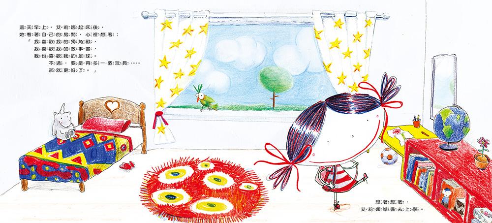 雖然已經有很多玩具了,小女孩起床後,看著自己的房間,一一點名她的玩具,心裡想著:「我喜歡我的獨角獸,我喜歡我的故事書,我也喜歡我的足球。不過,要是再多一個玩具……那就更好了。」