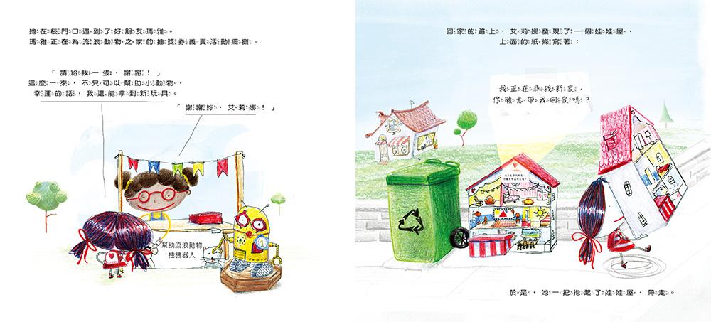 於是,決定不再蒐集玩具!她只留下自己最喜歡的玩具,其他的玩具拿出來擺攤賣,把玩具分享給其他的孩子,還把賣玩具所得的錢捐給流浪動物之家。當阿姨問她要什麼生日禮物時,這一次小女孩不再說要玩具了。她跟阿姨要的禮物是……「我想和妳一起去公園散步,還想聽妳說一個妳所遇過最美妙的故事。」