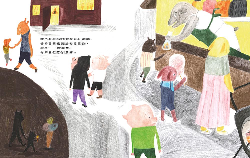 這是一本題材很特別的繪本,以一個孩子排隊買冰淇淋所遇到的事做為故事的主軸。