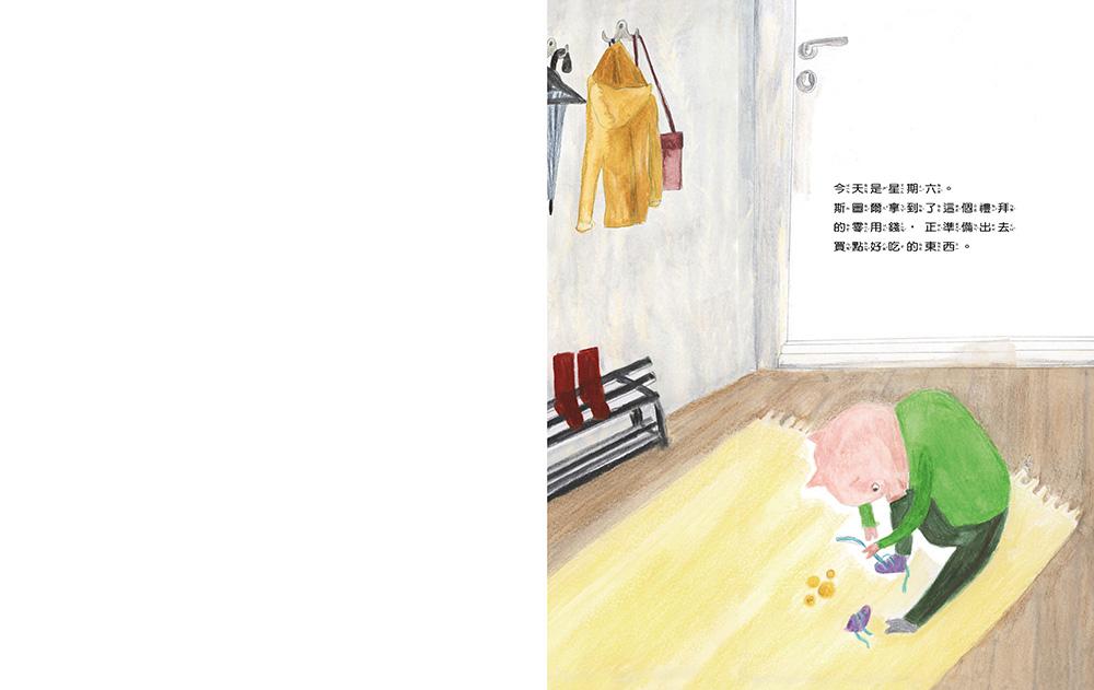 等了一個禮拜,好不容易領到零用錢。斯圖爾興沖沖地要去買他最愛的冰淇淋,誰知道排隊的隊伍好長好長!為了好吃的冰淇淋,斯圖爾心甘情願地開始排隊。本來應該是很無聊的排隊過程,斯圖爾卻在排隊等待的過程中,救了一隻翻肚的瓢蟲,為了怕螞蟻摔下來,定定地不敢動,讓螞蟻從他鞋上爬過。排隊當然免不了遇上插隊的人,一群學生插隊、一個帶著嚎哭小嬰兒的家庭也插隊。但是,斯圖爾都靜靜的默不作聲。他想,小嬰兒可能更需要冰淇淋吧!