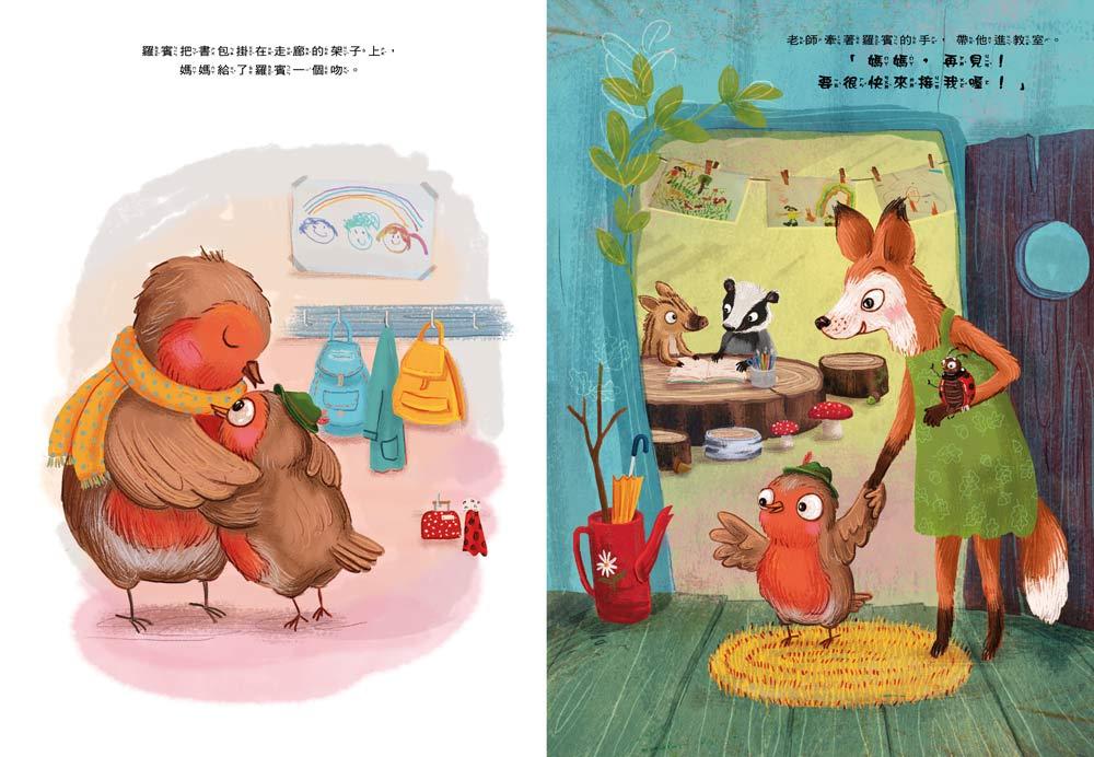 本書為孩子清晰地列出去上學會發生的事,告訴他們,其實,學校就是這麼回事,有好多好玩的事可以做!故事裡,鳥寶寶羅賓由一開始的不情願,到後來不斷問著「老師,我們現在要做什麼 ?」,對接下來還會發生什麼有趣的事充滿期待。閱讀的同時,家長也可以告訴孩子,你看,第一天,老師會帶著你進教室,讓你坐在他旁邊;你看,可以主動跟老師說要上廁所,你自己就可以做到……讓孩子邊聽故事,邊為離開爸爸媽媽和熟悉的家裡做準備。
