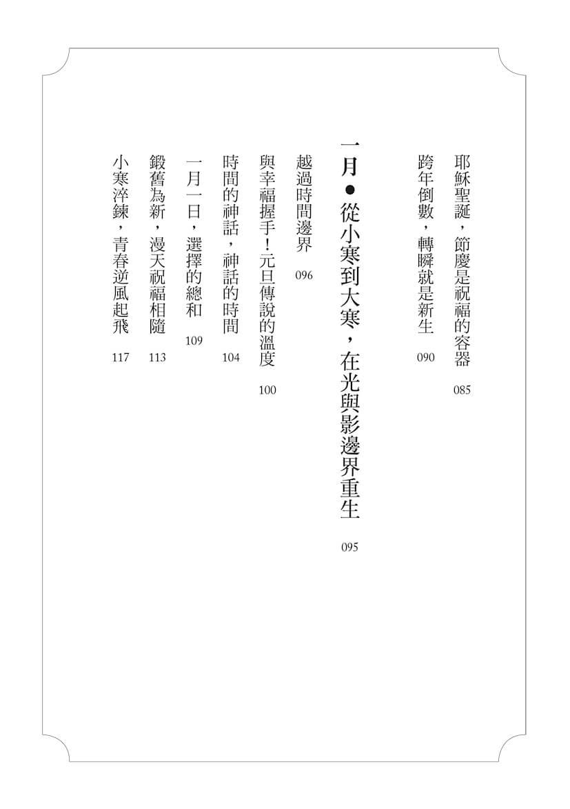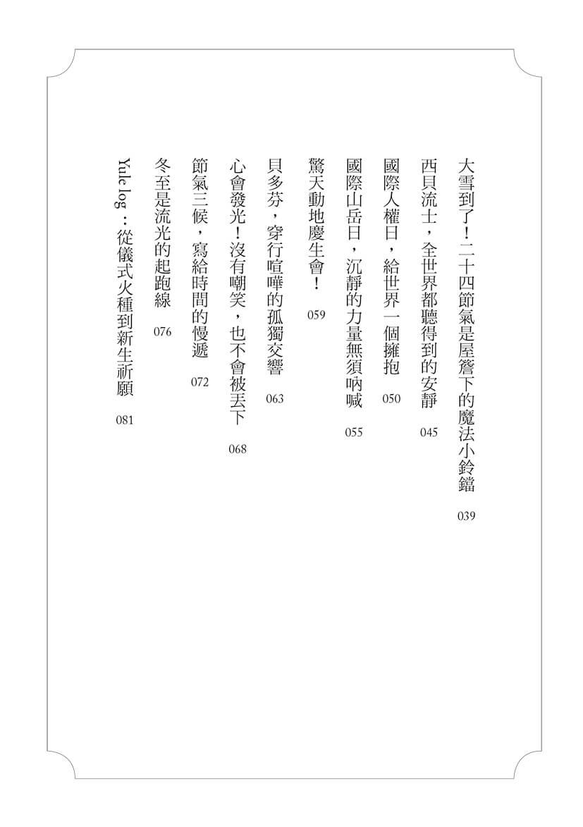 讀著冬日典故書,宛如為生活添加光焰,在封凍艱難的日子裡看見希望。隨著曆法演變,感受全世界從古到今的文化風俗,在新、舊兩個年間,調整生活速率,規劃未來,孕養著無限可能。