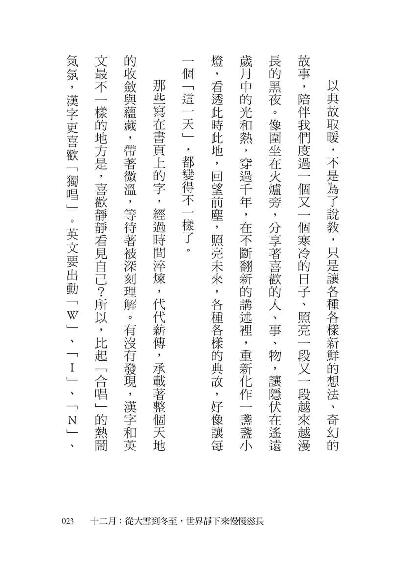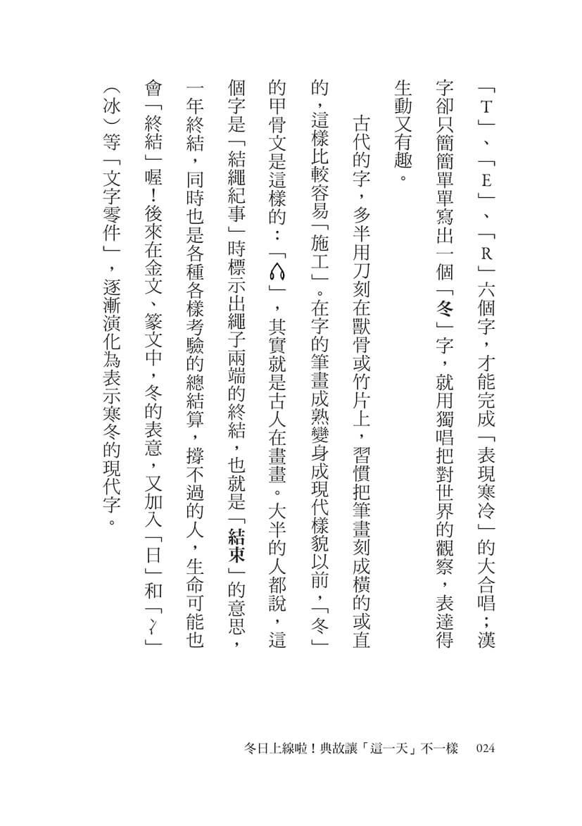 那些寫在書頁上的字,經過時間淬煉,代代薪傳,承載著整個天地的收斂與蘊藏,帶著微溫,等待著被深刻理解。有沒有發現,漢字和英文最不一樣的地方是,喜歡靜靜看見自己?所以,比起「合唱」的熱鬧氣氛,漢字更喜歡「獨唱」。英文要出動「W」、「I」、「N」、「T」、「E」、「R」六個字,才能完成「表現寒冷」的大合唱;漢字卻只簡簡單單寫出一個「冬」字,就用獨唱把對世界的觀察,表達得生動又有趣。