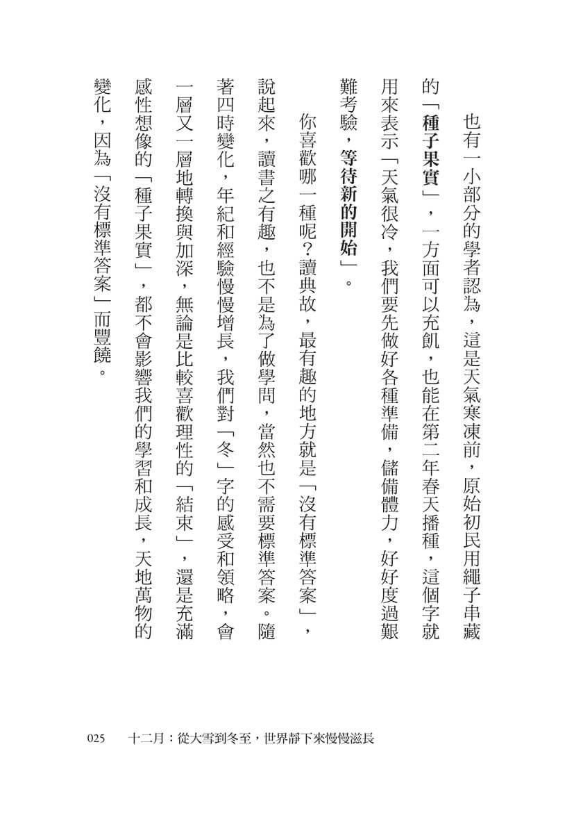 你喜歡哪一種呢?讀典故,最有趣的地方就是「沒有標準答案」,說起來,讀書之有趣,也不是為了做學問,當然也不需要標準答案。隨著四時變化,年紀和經驗慢慢增長,我們對「冬」字的感受和領略,會一層又一層地轉換與加深,無論是比較喜歡理性的「結束」,還是充滿感性想像的「種子果實」,都不會影響我們的學習和成長,天地萬物的變化,因為「沒有標準答案」而豐饒。