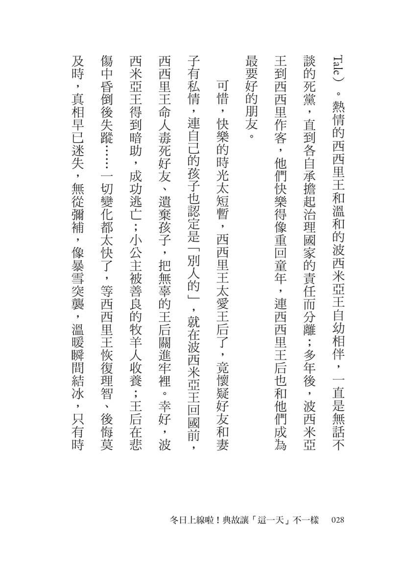 可惜,快樂的時光太短暫,西西里王太愛王后了,竟懷疑好友和妻子有私情,連自己的孩子也認定是「別人的」,就在波西米亞王回國前,西西里王命人毒死好友、遺棄孩子,把無辜的王后關進牢裡。幸好,波西米亞王得到暗助,成功逃亡;小公主被善良的牧羊人收養;王后在悲傷中昏倒後失蹤……一切變化都太快了,等西西里王恢復理智、後悔莫及時,真相早已迷失,無從彌補,像暴雪突襲,溫暖瞬間結冰,只有時間,才能為未知的命運和選擇翻轉解凍。