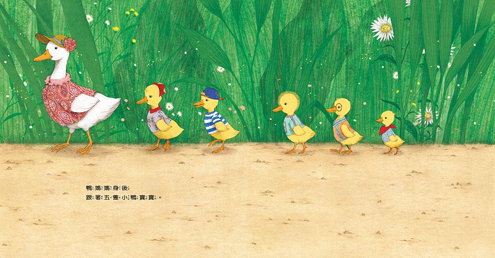 鴨媽媽帶著五隻小鴨寶寶散步,第五隻小鴨問第四隻小鴨:媽媽在前面嗎?第四隻小鴨問第三隻小鴨:媽媽在前面嗎?在後面的小鴨因為看不到媽媽,所以一隻跟著一隻地問,小鴨們只要確定媽媽在,便安心了。然後是回答,第一隻小鴨回答第二隻小鴨:媽媽和我都在啊!第二隻小鴨回答第三隻小鴨:媽媽、姊姊和我都在啊!第五隻最小的鴨寶寶於是充滿自信地說:知道我為什麼走在最後面嗎?因為我是最勇敢的……而,這最勇敢的壓陣小鴨對於保護家人、對抗邪惡的鱷魚,可是有無限的想像呢!