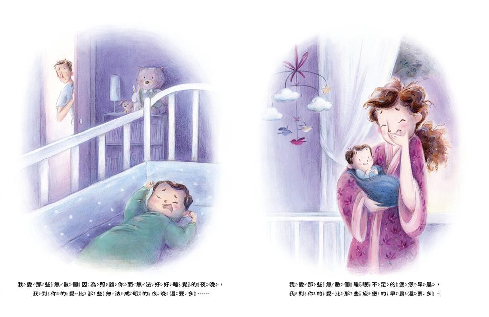 剛開始,孩子剛剛出生時,父母徹夜不眠的照顧孩子,所以文字以「我愛那些無數個因為照顧你而無法好好睡覺的夜晚,我對你的愛比那些無法成眠的夜晚還要多……」配上爸爸半夜憂心地探視睡在嬰兒床的小小孩。晚上睡不好,隔天早上當然很疲憊,在另一頁裡,圖像是媽媽抱著剛睡醒的小嬰兒,說:「我愛那些無數個睡眠不足的疲憊早晨,我對你的愛比那些疲憊的早晨還要多。」然後是「我對你的愛比你每天灑了滿地的麥片還要多……」、「我對你的愛也比你每天打翻、流了滿桌的牛奶還要多。」每一頁都是尋常的親子生活的日常,文字以父母的口吻深情地向孩子告白,即使是這些微不足道的小事,也處處蘊藏著父母無盡的愛。一個人從小到大吃過的麥片、打翻過的牛奶,肯定是數也數不完的,作者以比麥片更多、比打翻的牛奶更多,巧妙的將父母的愛比喻為在生活中時時刻刻都存在,也比孩子想像的多更多。就算孩子為父母在生活上帶來許多混亂,甚至讓父母無法安穩成眠,即使是這樣負面的生活影響,父母也甘之如飴地說:我愛你!比你想像的更多!