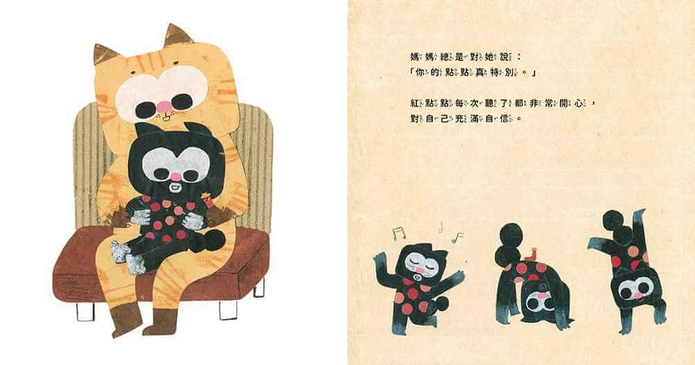 《紅點點》的故事概念,其實源自我女兒三歲時隨口編的故事——「某隻身上長滿紅點點的貓」。我當時聽了覺得非常有趣,就偷偷記了下來,放在筆記裡好幾年。直到多年後,我才將它改編成繪本故事。故事中的紅點點,其實象徵著自信、成就感等心理狀態。經過一次又一次的挫折後,紅點點掉光了,她非常難過,但媽媽安慰她說:「心情低落的時候,就好好吃一頓、好好睡一覺吧!明天又是新的一天!」