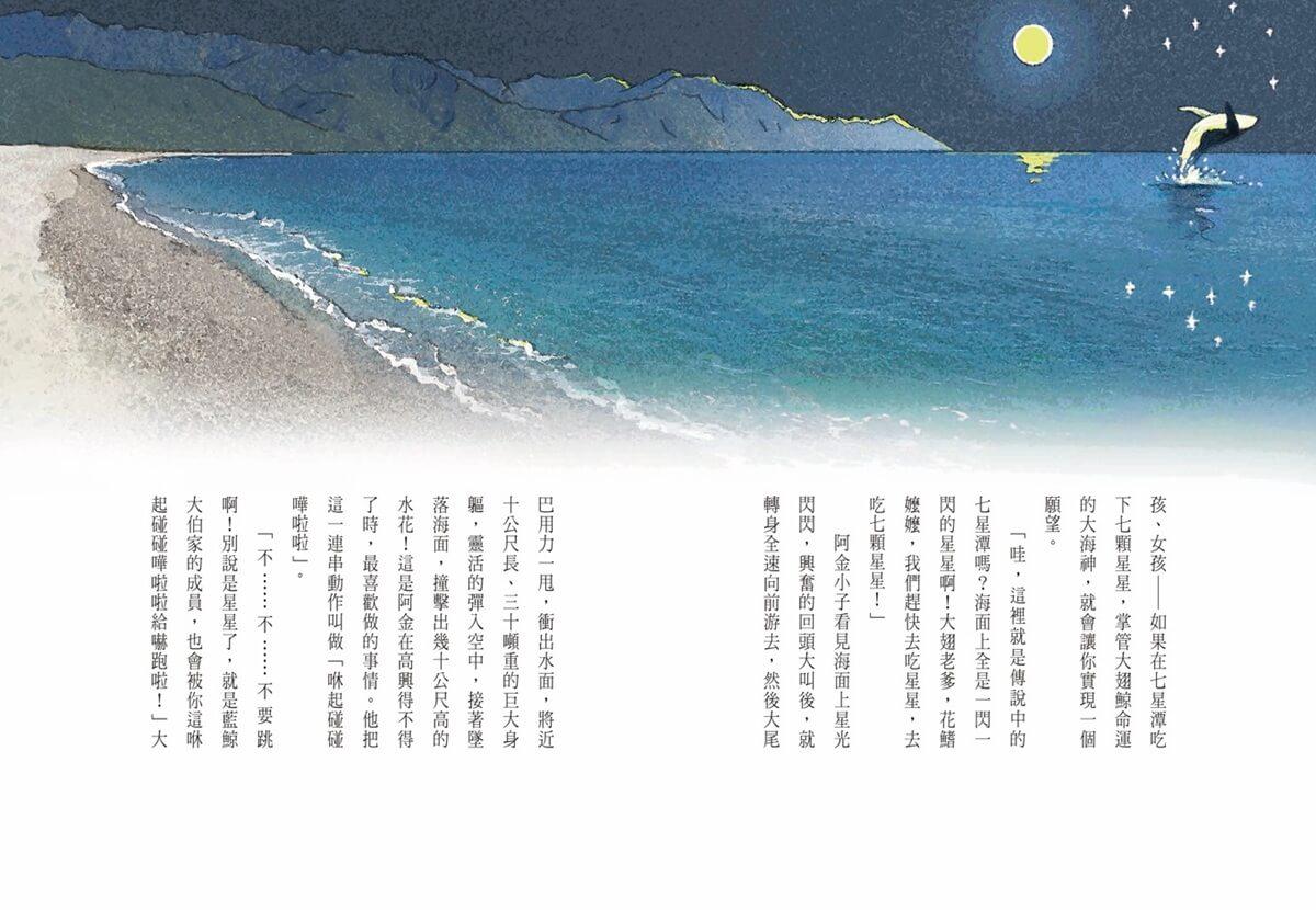 「哎呀呀,大翅老爹,你別跟孩子開玩笑了,藍鯨大伯比我們更不常到這裡來,不管阿金小子做幾次咻起碰碰嘩啦啦,也嚇不到他們。倒是你再仔細看一看,這海面上的光點,真的都是星星嗎?如果真的是星星,那傳說中實現願望的方法,也太簡單了吧!」游在最後面的花鰭嬤嬤,加速上前來替阿金說話,也提出了一項疑問。