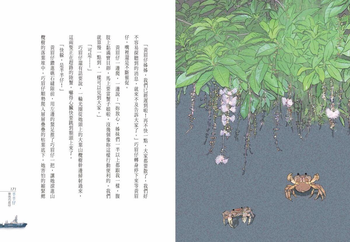但是,當我讀到陳素宜這本生態童話,整個驚豔啊。光看〈沒鰭〉、〈兩腳〉、〈無尾猴〉和〈半半仔〉四篇故事的標題,你可能會以為這些名稱指涉的是數種野生動物。不過,細讀以後,你才會發現,這些充滿奇趣的名稱所代表的都是人類,而且所有與人類之間的故事與困擾,都是由大翅鯨、黑鳶、臺灣獼猴與陸蟹以第一人稱發聲。