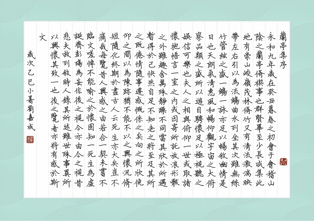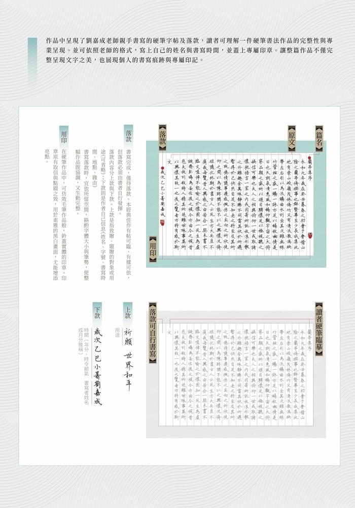 完整呈現劉嘉成老師自運〈蘭亭集序〉的全文、落款與用印,細細欣賞老師每一筆、每一字的力量,感受文章深厚意境。