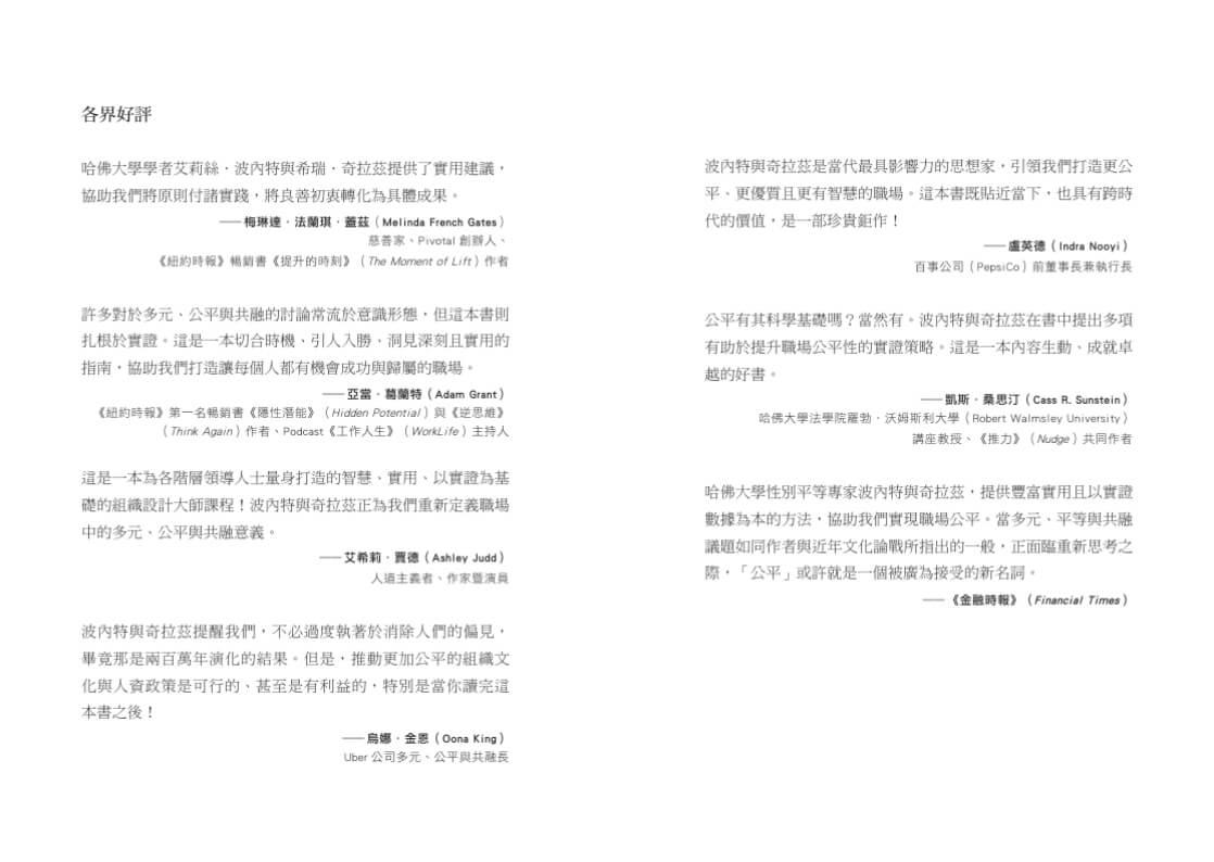 哈佛大學性別平等專家波內特與奇拉茲,提供豐富實用且以實證數據為本的方法,協助我們實現職場公平。當多元、平等與共融議題如同作者與近年文化論戰所指出的一般,正面臨重新思考之際,「公平」或許就是一個被廣為接受的新名詞。──《金融時報》(Financial Times)