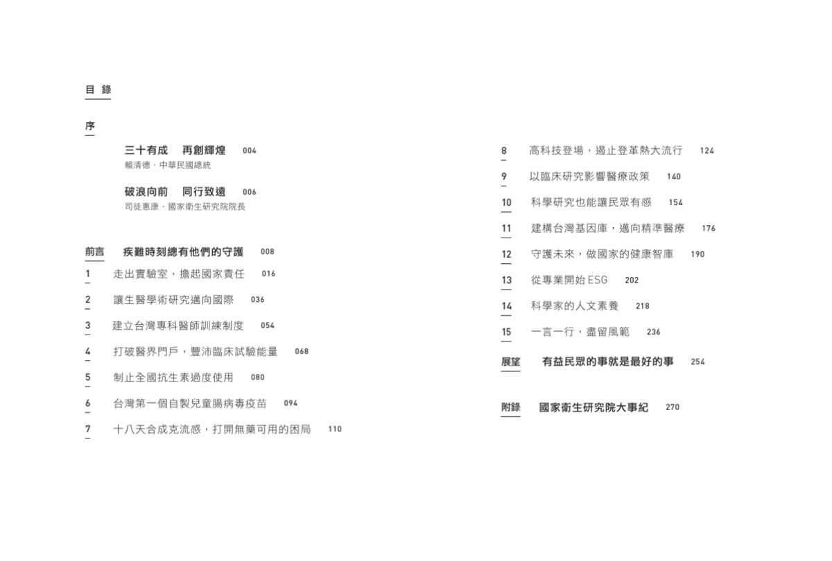 三十院慶,是回顧,也是前瞻;有喜悅,也有自省;是責任,更是承擔。一九九六年一月,國家衛生研究院正式成立,當時的我即將完成在美國史丹佛大學的博士訓練,聽聞這所嶄新的機構正積極在海外延攬生醫研究人才,雖然心動,但身為國防醫學院的公費生,深知學成之後必須返回母校服務,因此只能以「觀察者」的身分見證這個象徵台灣生醫科學探索能量跨域提升,與國人公衛健康研究接軌國際的關鍵時刻!返國後隨著學術生涯經驗與能量的累積,開始參加國衛院不同的計畫審查、人員聘任、升等與學術諮詢等工作,身分也從當初的「觀察者」逐漸成為「參與者」;二〇一八年年初由國防醫學院退伍,正式加入國衛院;更於二〇二二年接任第七任院長,有幸成為本院的「領航者」。這個角色讓我深切體會到這個機構的靈魂與生命力!也由長期的「觀察者」、「參與者」到「領航者」身分轉換的過程中,看見國衛院的能量、困難、挑戰與機會,更見證了這本書的誕生。